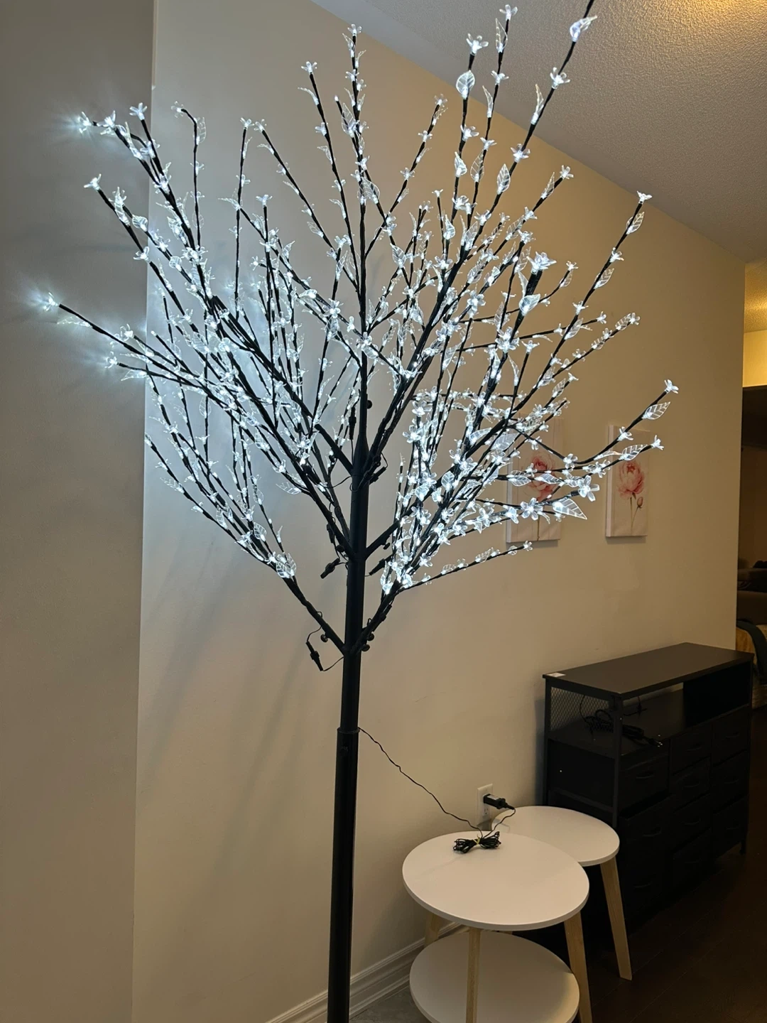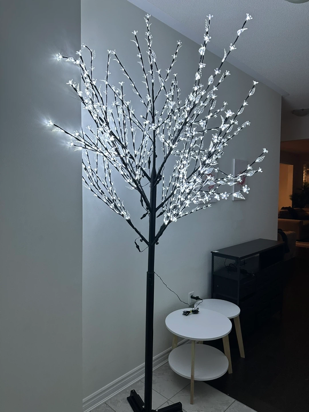 This decorative tree features numerous white LED lights on its branches, creating a lovely ambiance. It's powered by an electrical plug. This illuminated tree is perfect for adding a festive or elegant touch to your home decor indoors.