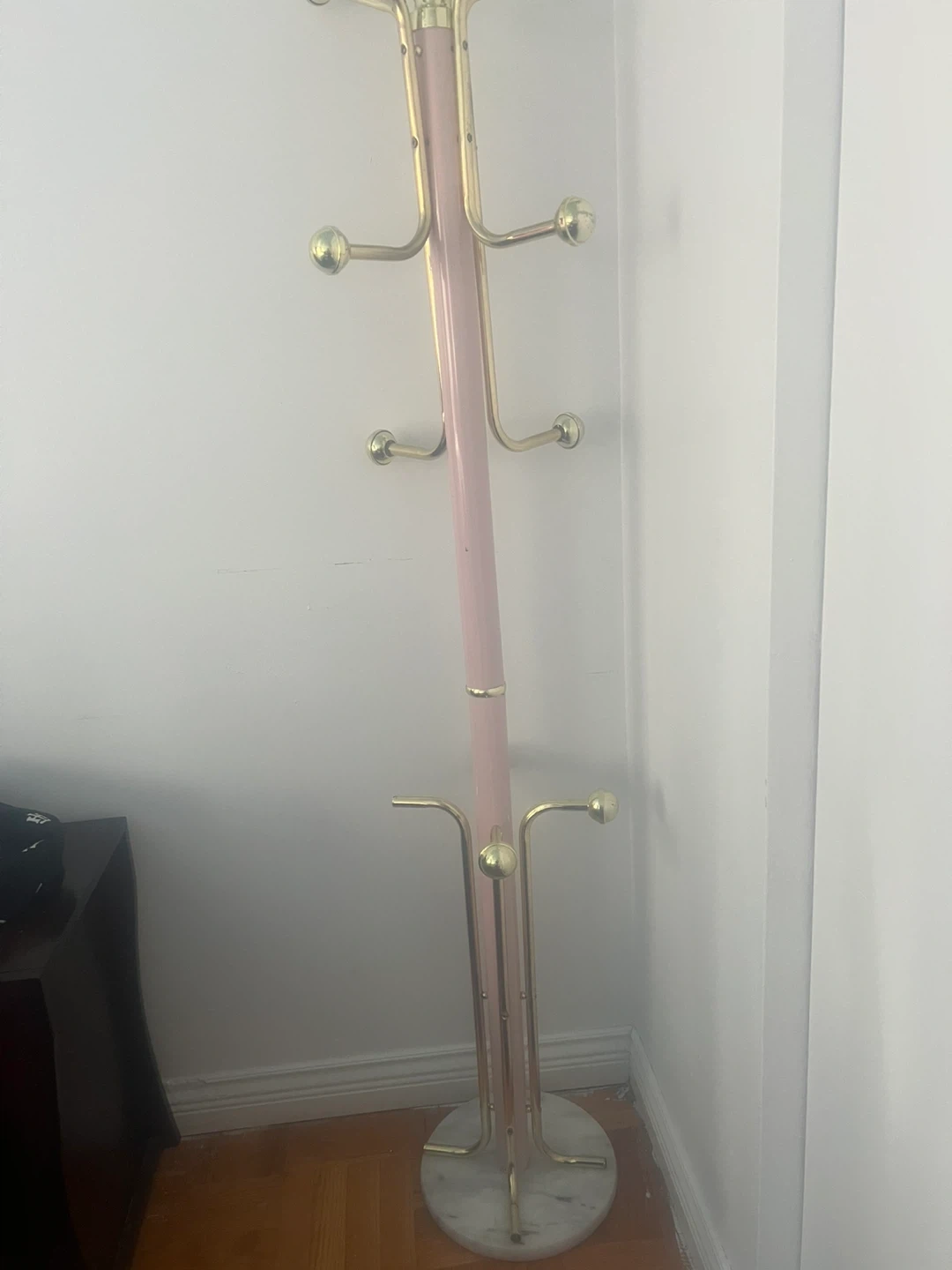 This vintage-style coat rack features a pale pink central pole with multiple gold hooks. It has a marble base for stability. It's handy for keeping coats, hats, and scarves organized.