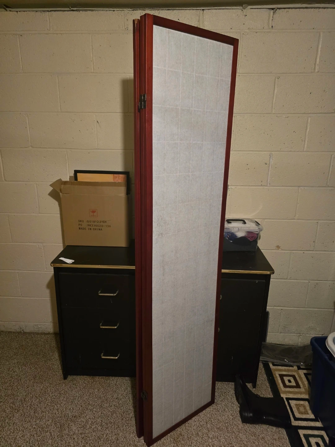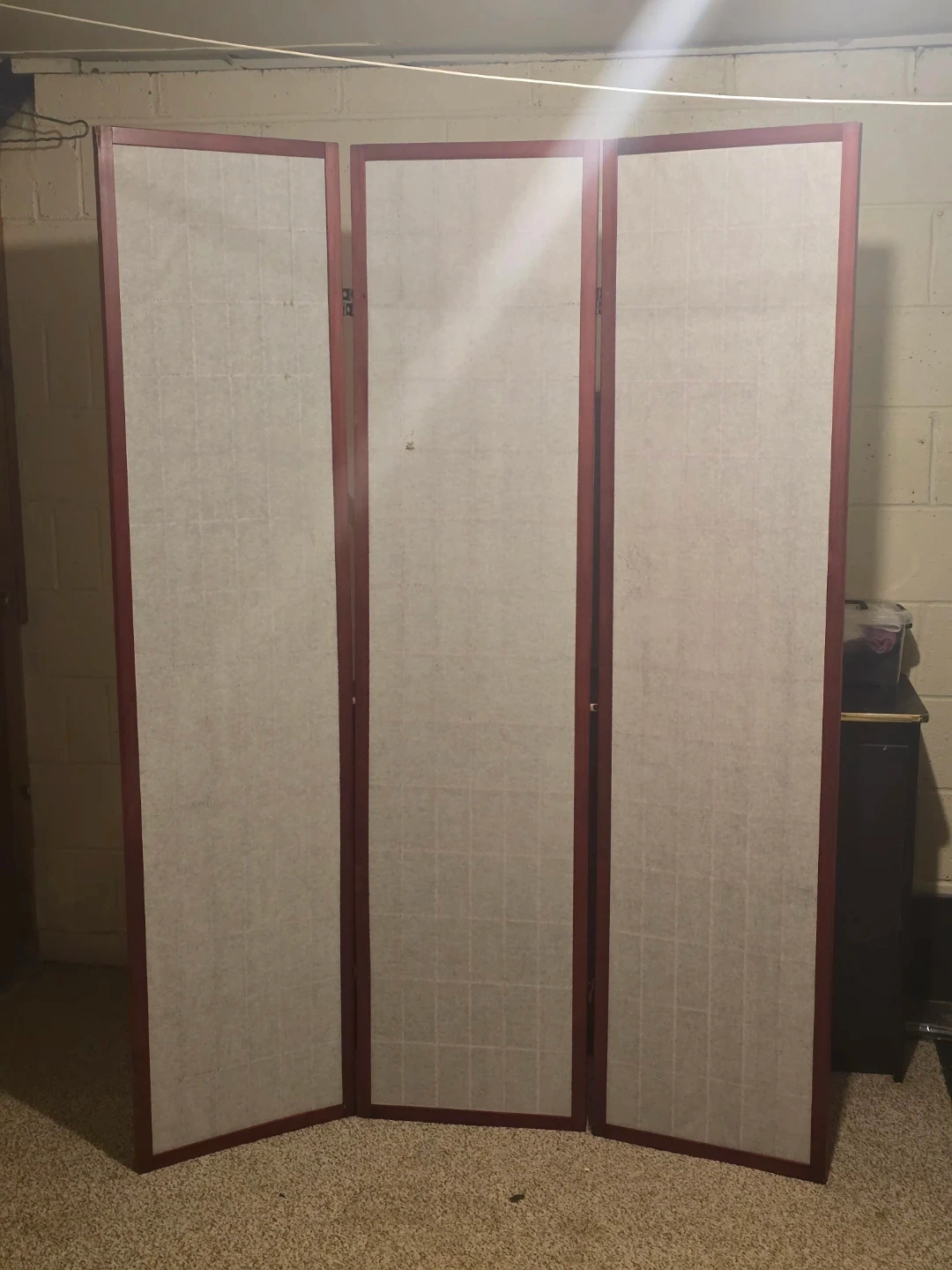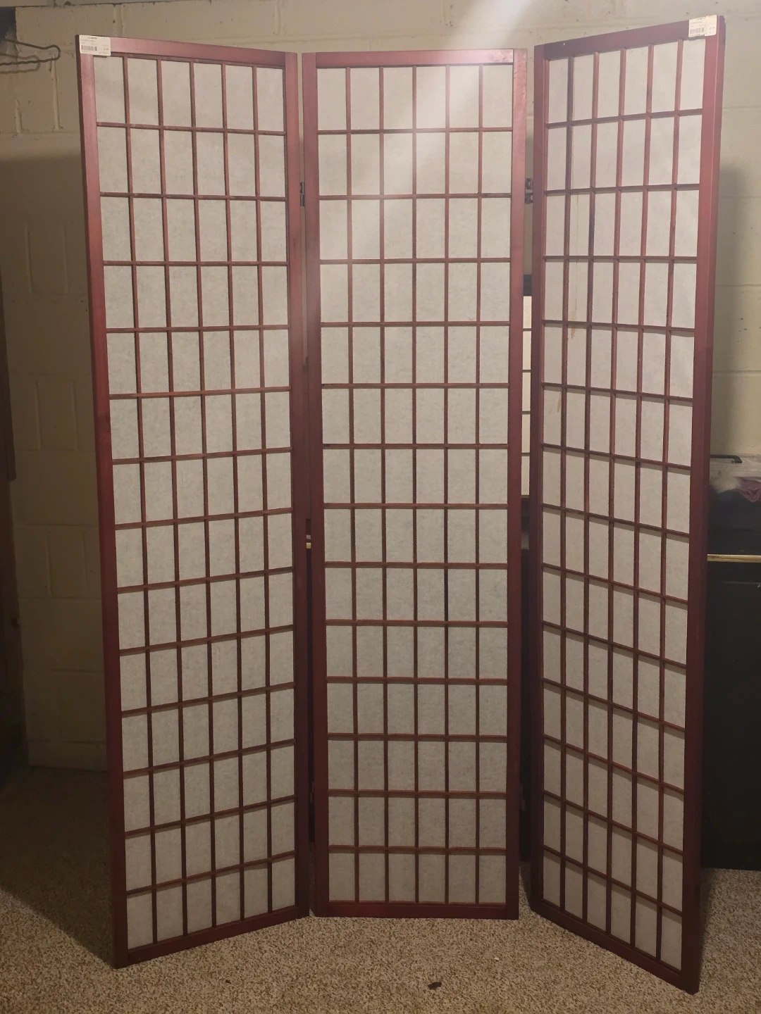 Selling a folding room divider screen. It features a wooden frame with a grid pattern on the panels. Great for adding privacy or dividing a space! (70" x 17" closed. 70" x 52" opened).