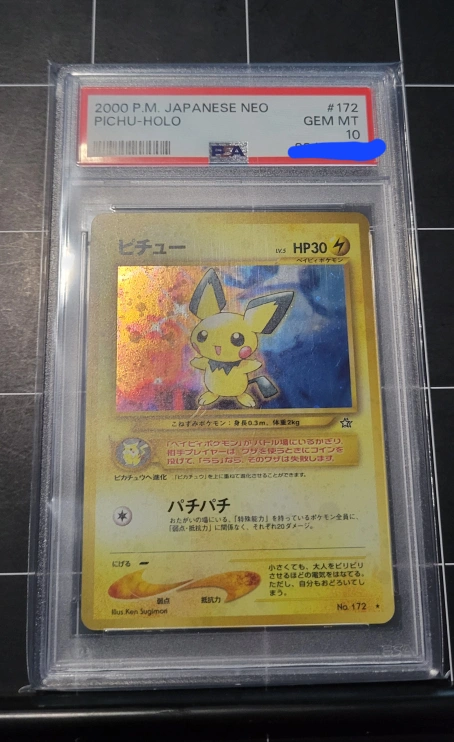 Selling a 2000 P.M. Japanese Neo Pichu Holo Pokemon card, graded Gem Mint 10 by PSA! A great addition to any collection