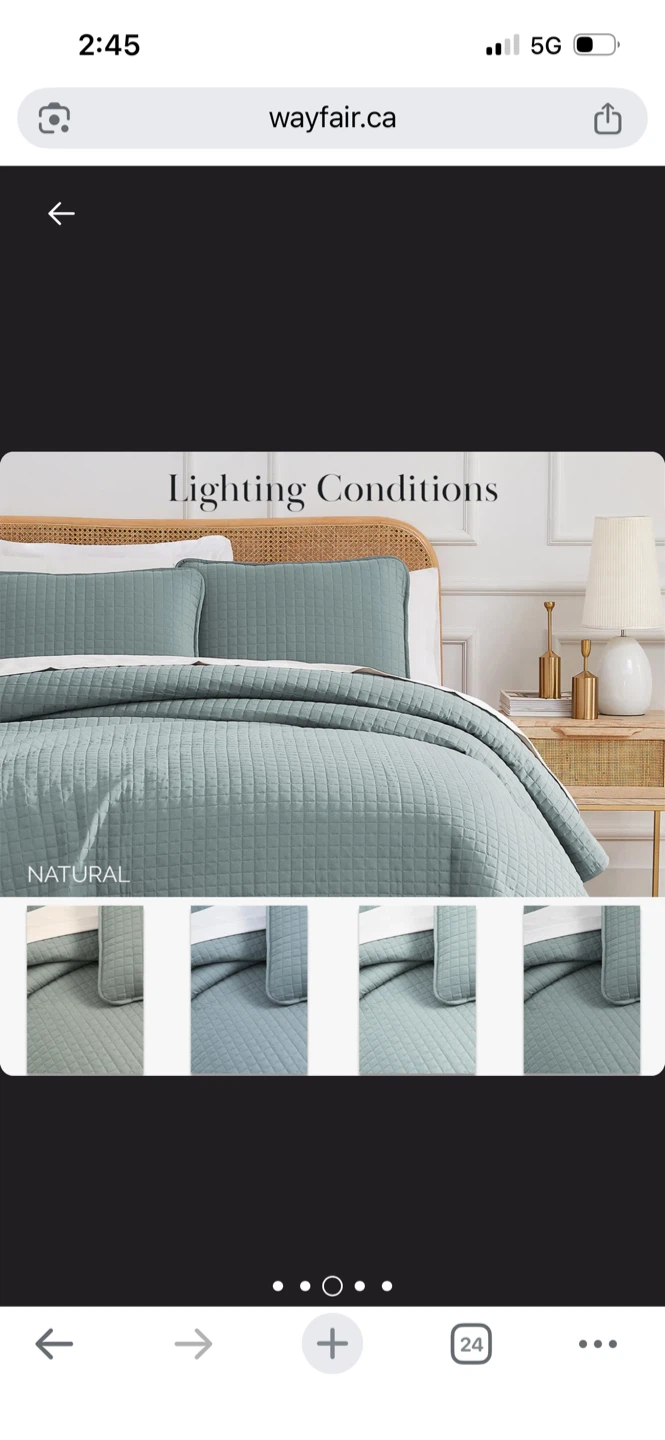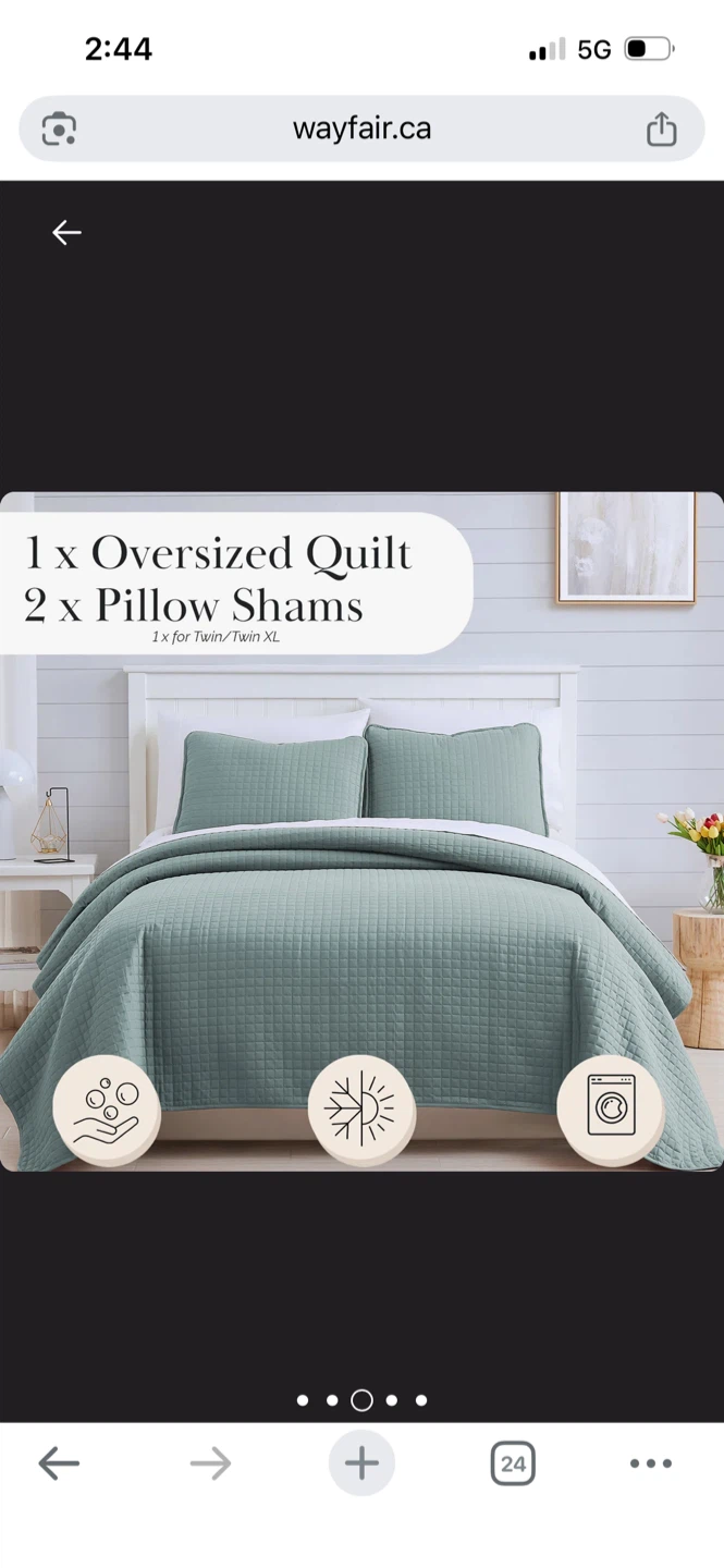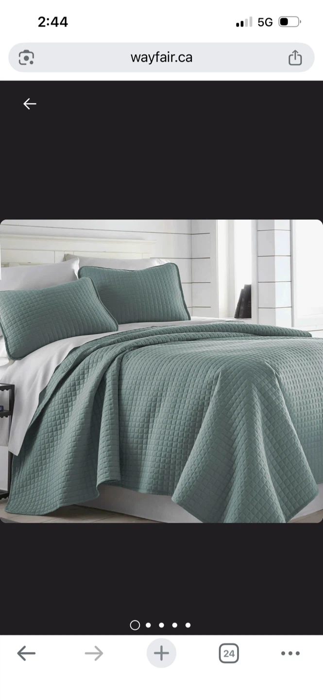 This set includes one oversized quilt and two pillow shams. It's a lovely sage green colour with a diamond quilting pattern. Machine washable for easy care!