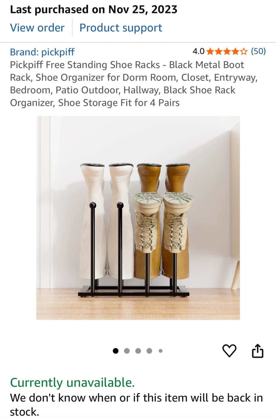 60Selling a Pickpiff free-standing shoe rack in black metal! It's a great shoe organizer for dorm rooms, closets, entryways, bedrooms, patios, or hallways. It can hold up to 4 pairs of boots. Never used.