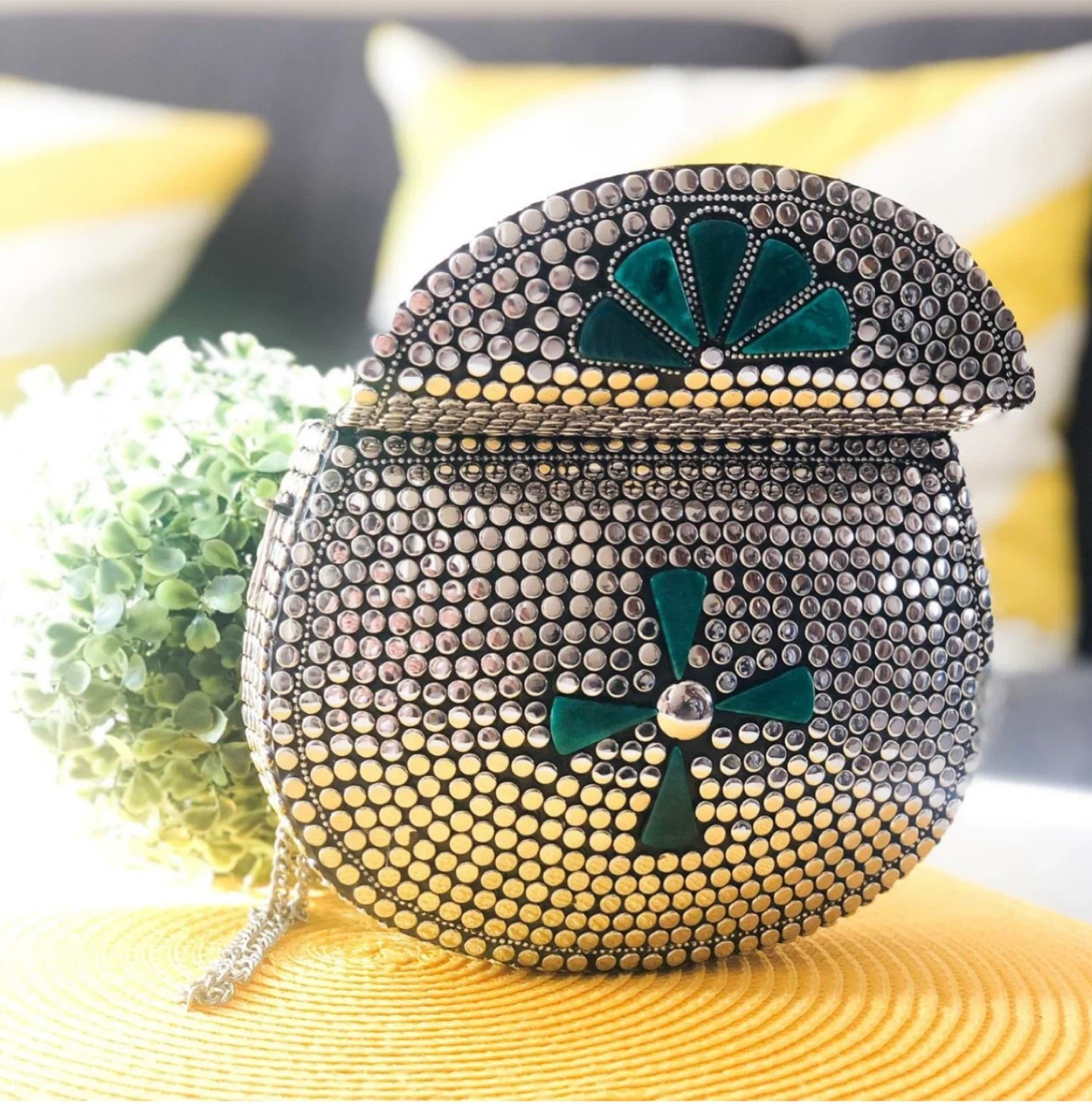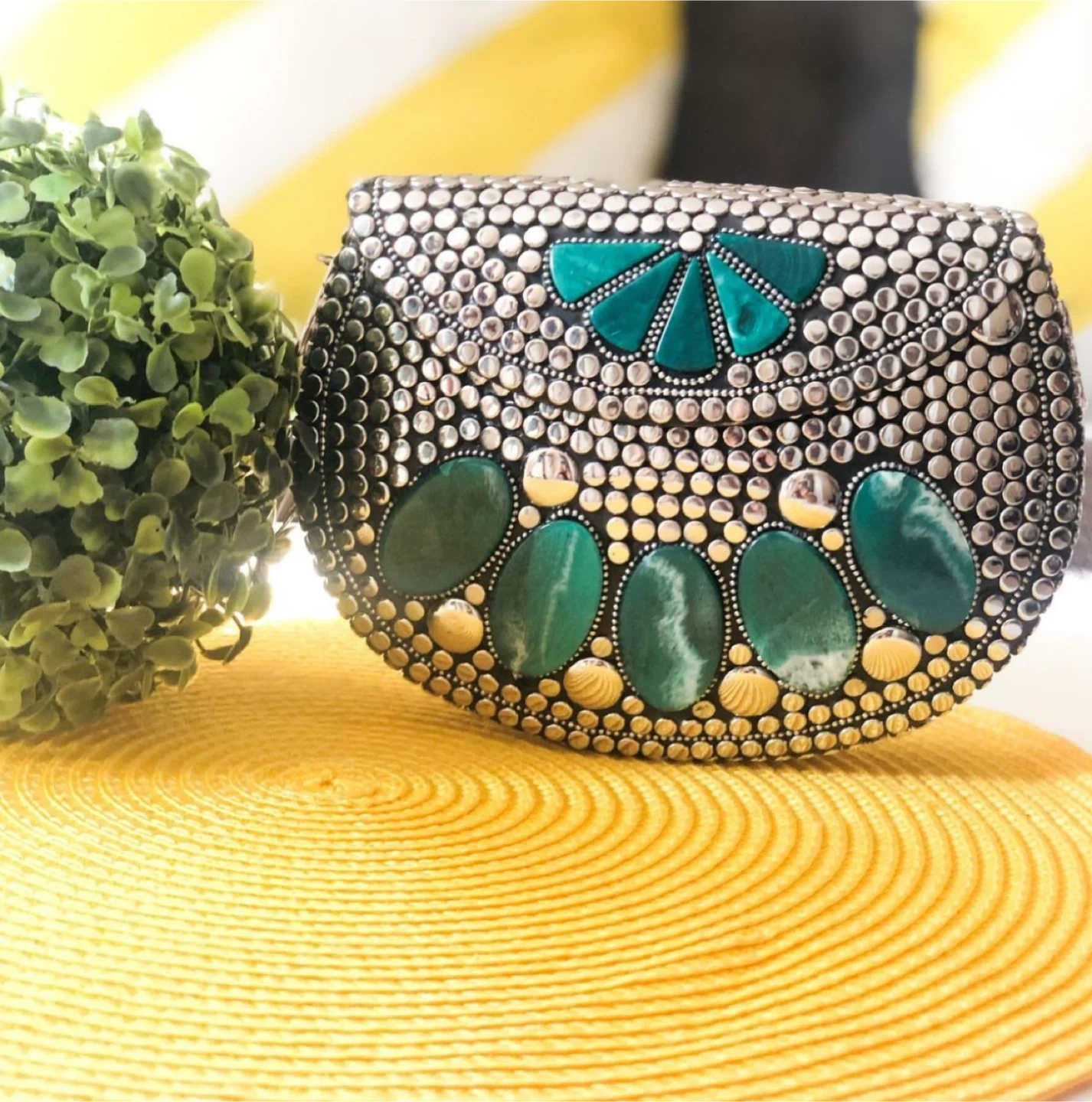 This is a unique embellished clutch purse. It features silver studs and green accents. It's perfect for a night out or special occasion!