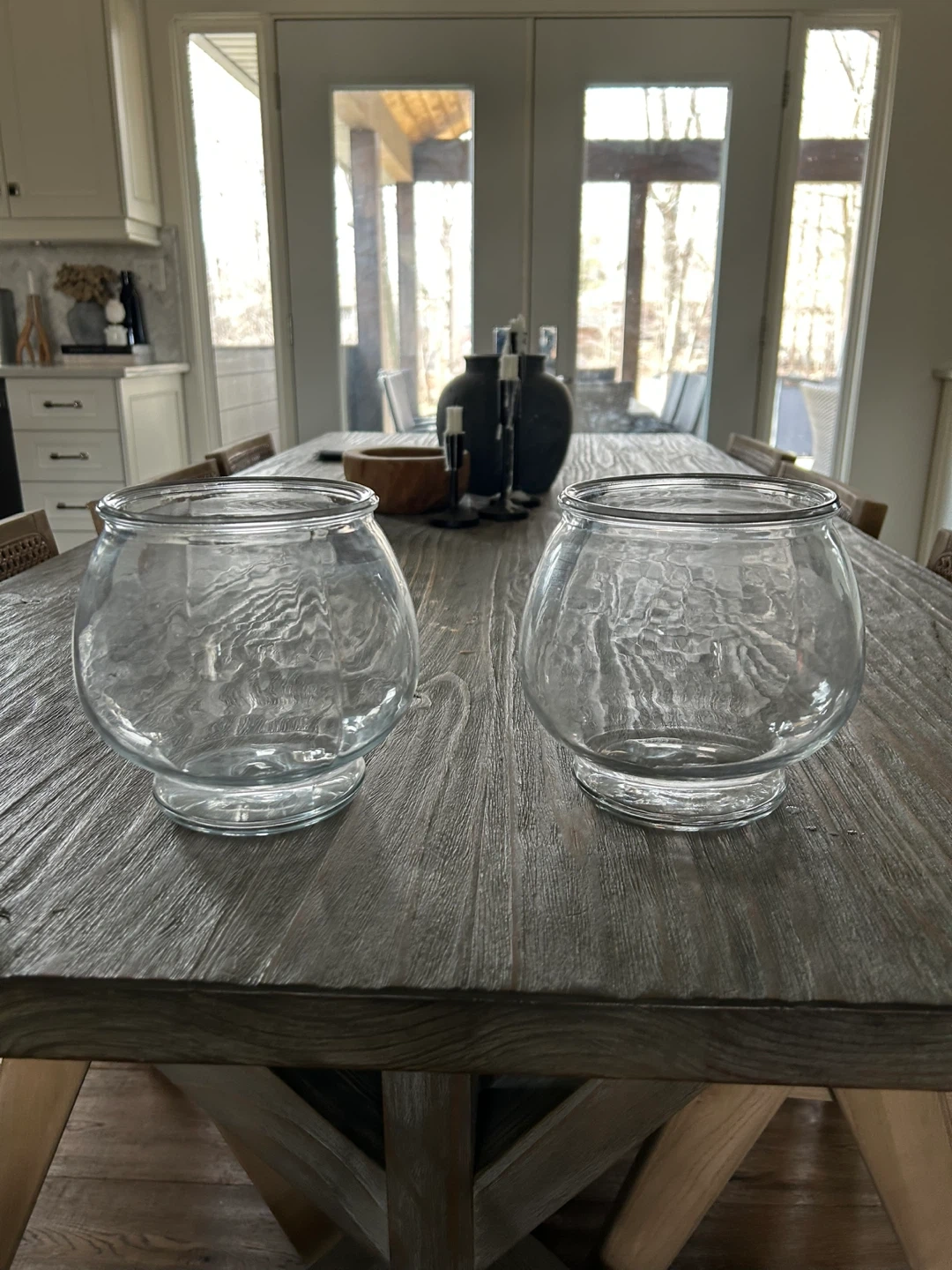 A set of two clear glass bowls. These are great for small fish or as decorative vases. They're made of clear glass. $6 each or both for $10