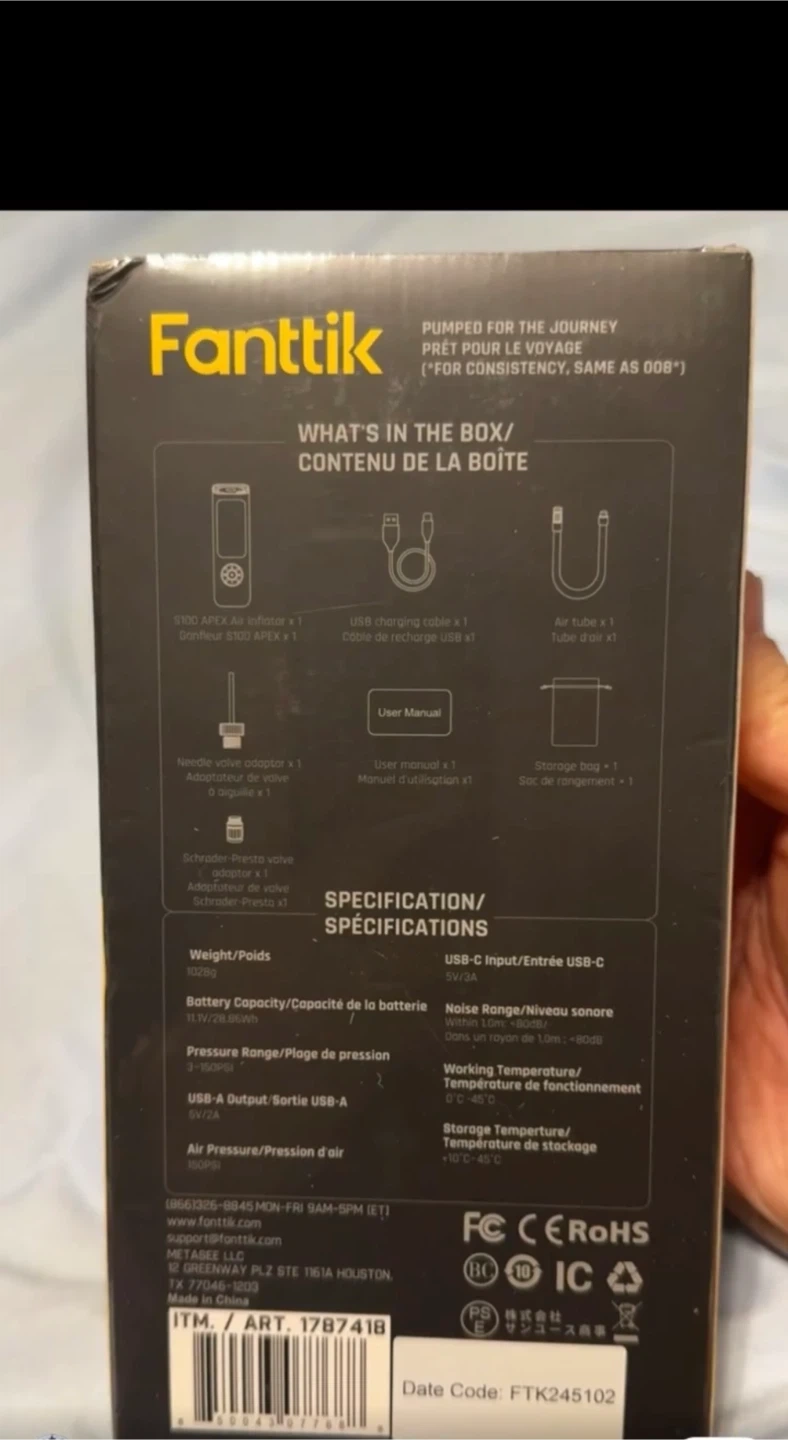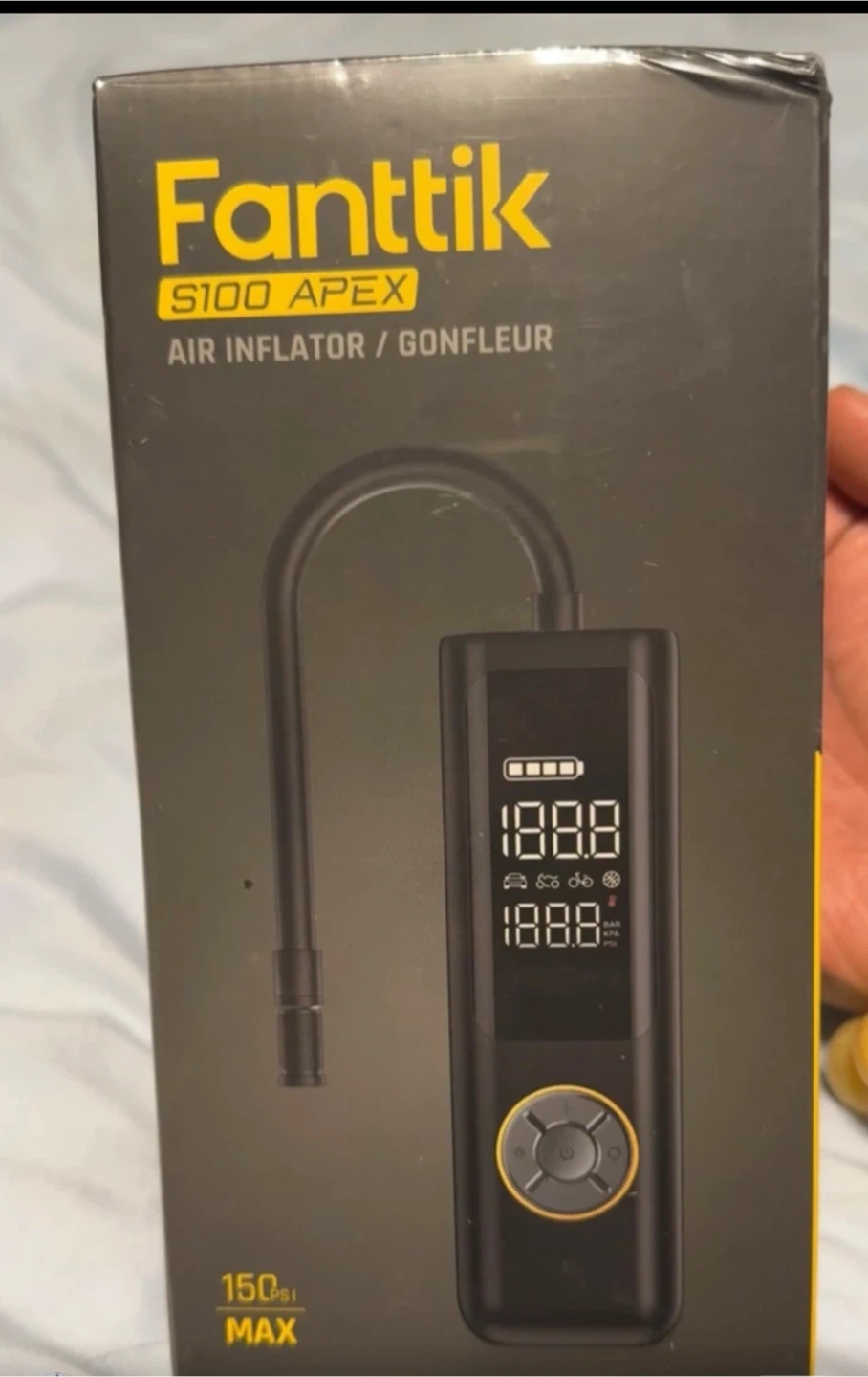This is the Fanttik S100 APEX portable air inflator. It comes with a USB charging cable, air tube, needle valve adapter, and Schrader valve adapter. Pressure range is 0-150 PSI.