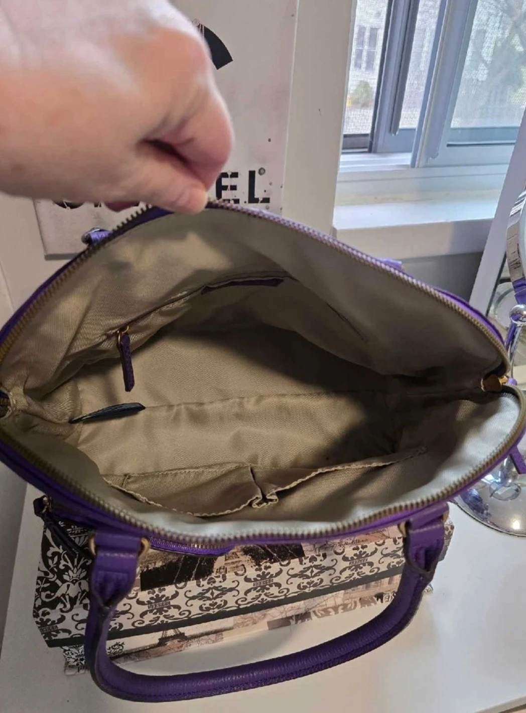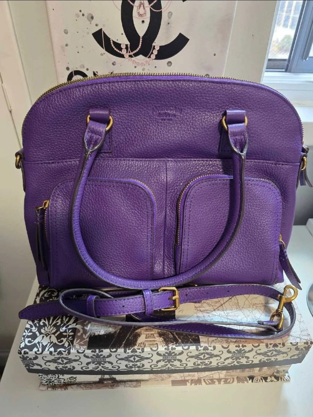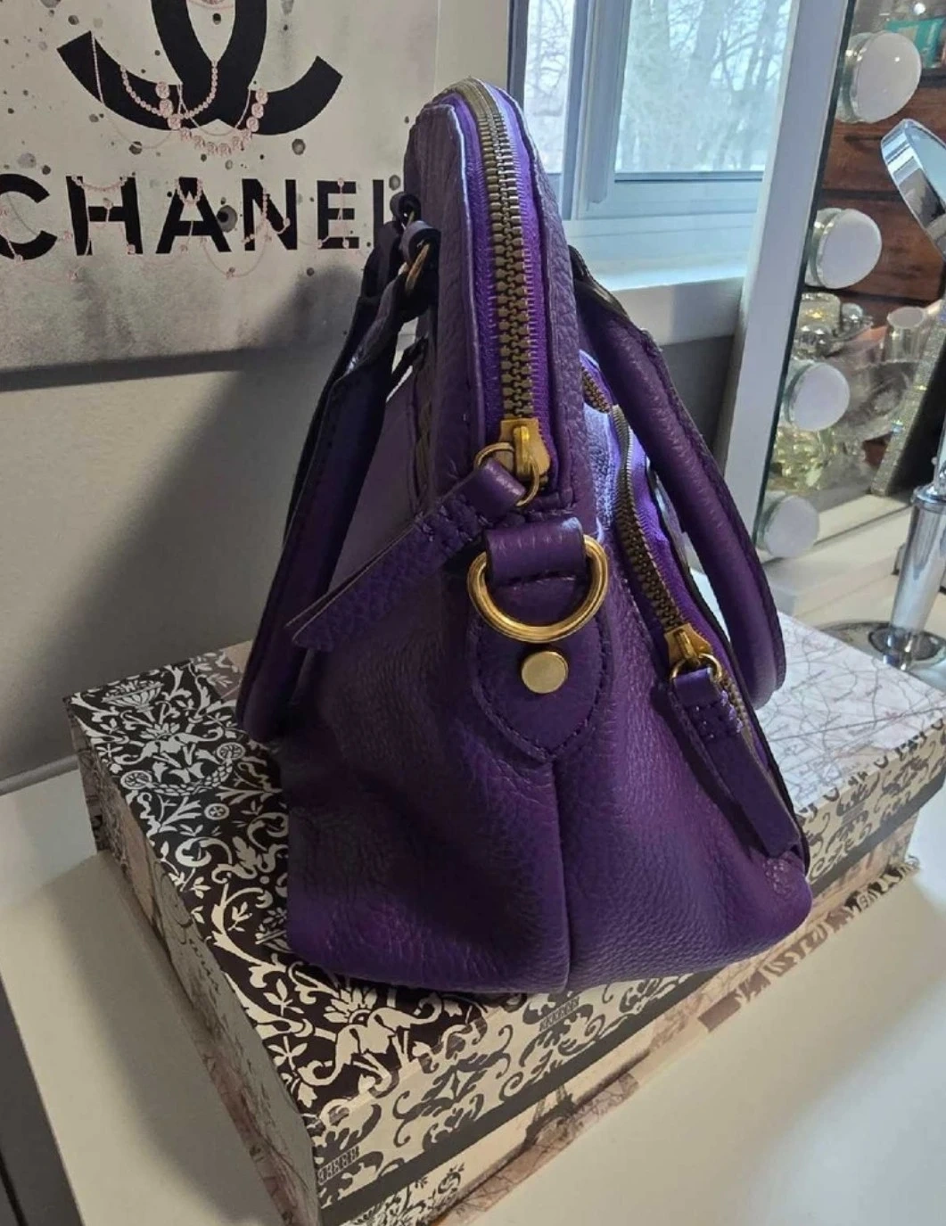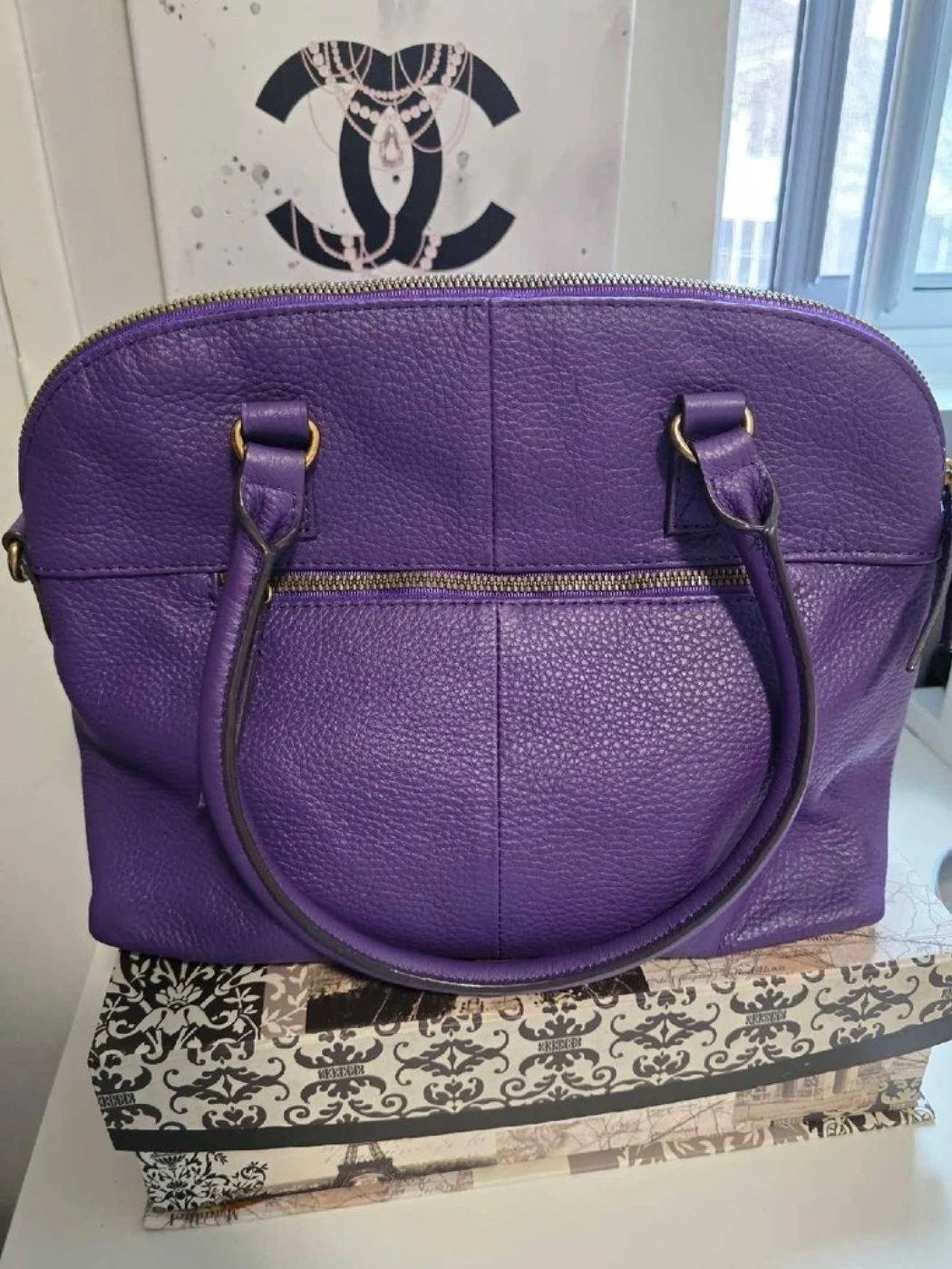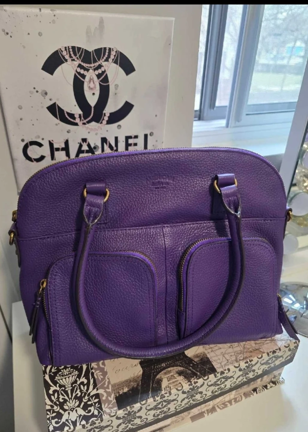 Purple pebbled leather handbag. It features multiple exterior zip pockets and a spacious interior with additional pouches. Comes with an adjustable shoulder strap.
