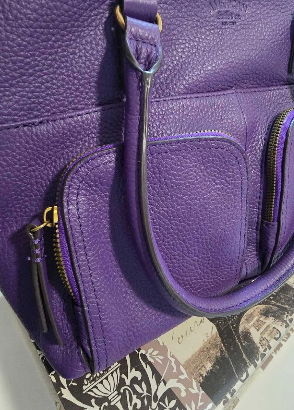 Purple pebbled leather handbag. It features multiple exterior zip pockets and a spacious interior with additional pouches. Comes with an adjustable shoulder strap.