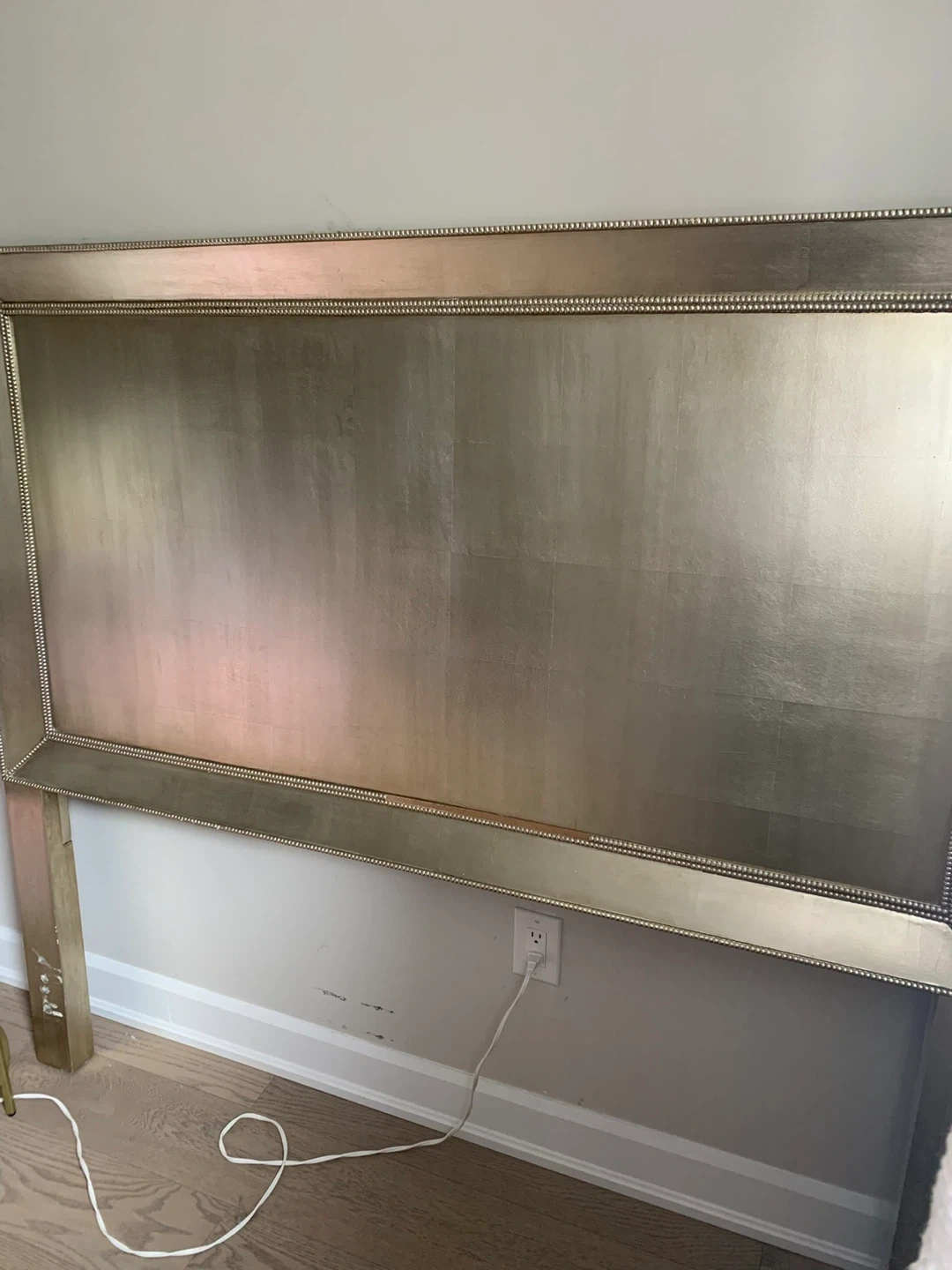 104Elevate your bedroom with this elegant queen-sized headboard from Pier 1 Imports. Originally purchased for over $1,000, this piece is now hard to find since Pier 1 closed its Canadian stores. Crafted from wood with a brushed Champaign silver hand-applied finish, the headboard features a beaded trim border that adds a luxe, glam touch — perfect for modern, transitional, or Hollywood Regency styles. The metallic paint gives the look of high-end mirrored furniture without the weight or fragility. • Size: Queen • Condition: Great overall; minor cosmetic wear that’s easily covered by pillows or bedding • Solid and well-built • Pickup in Pickering
