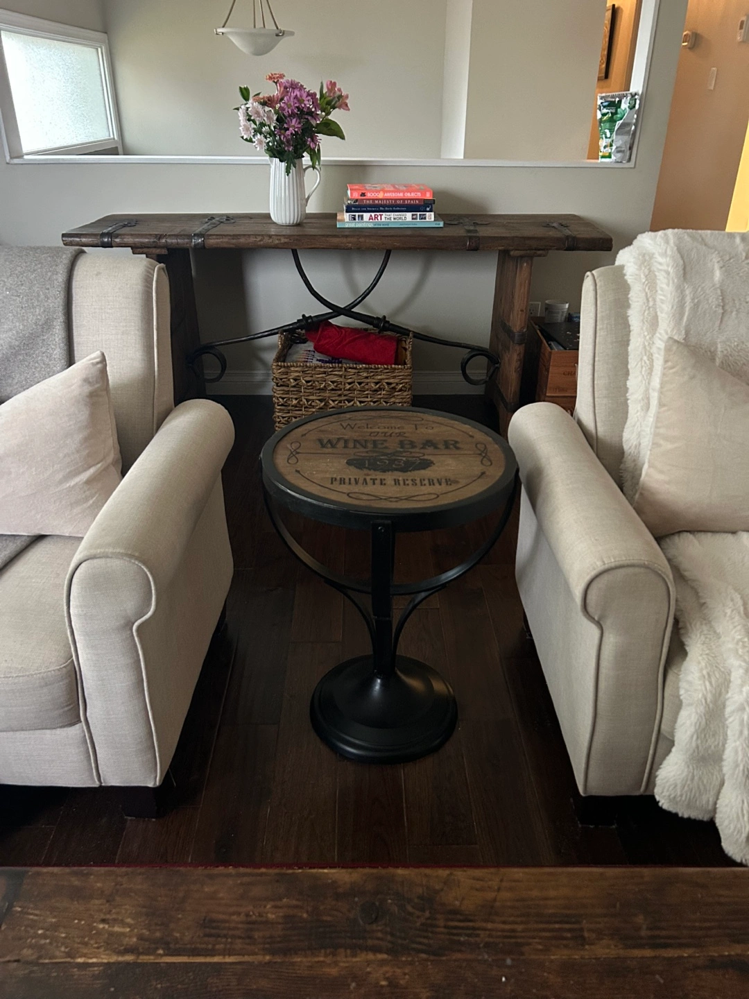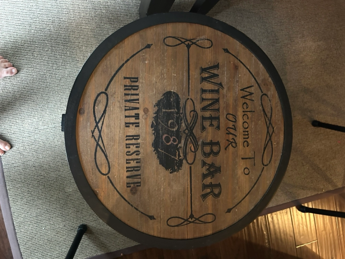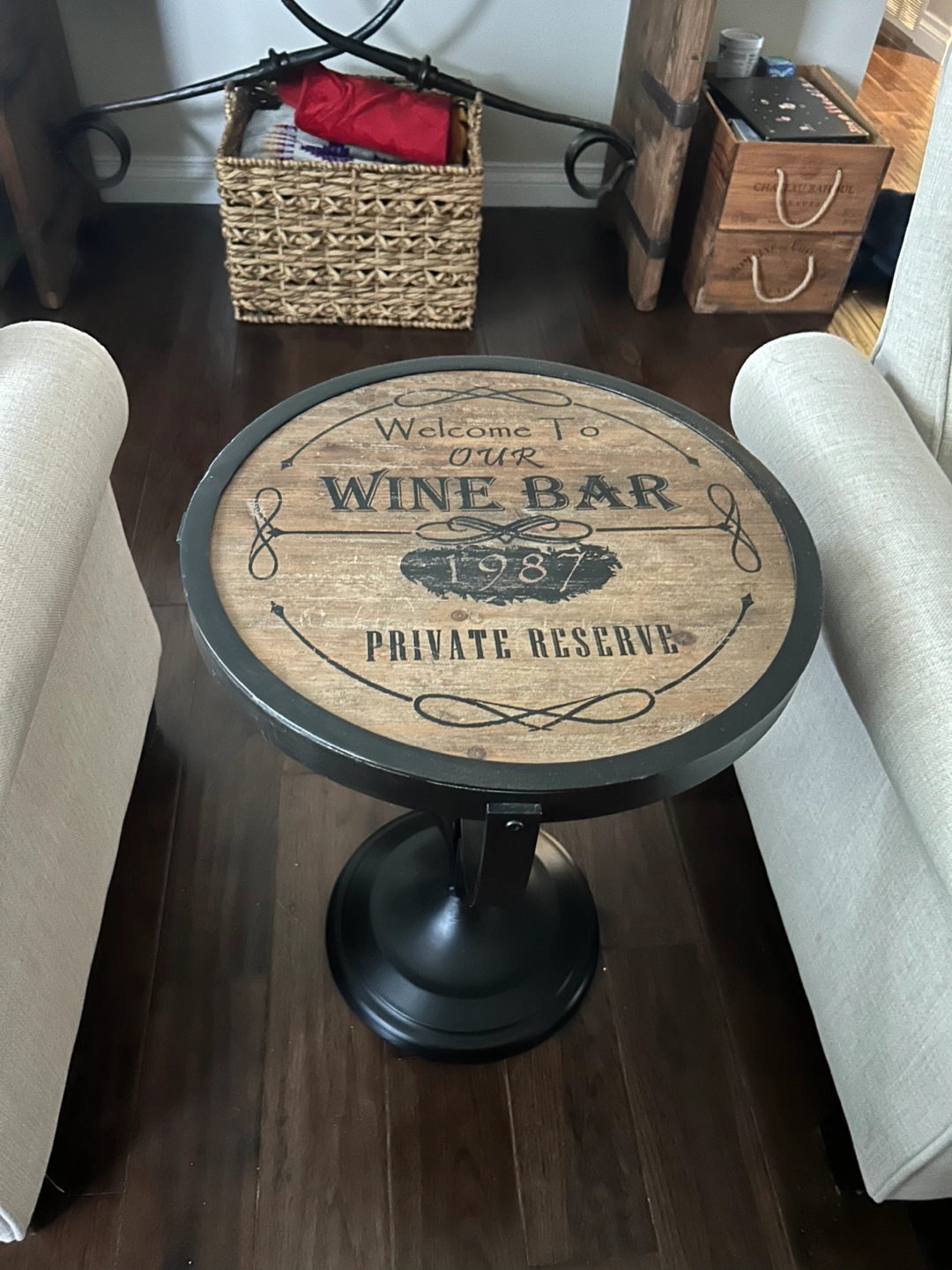 5Small round side table. Features a wine barrel design top. Black metal base. Perfect for a living room or bar area. Like new condition. Estimated retail $130.00 Pick up only-cash or e-transfer.