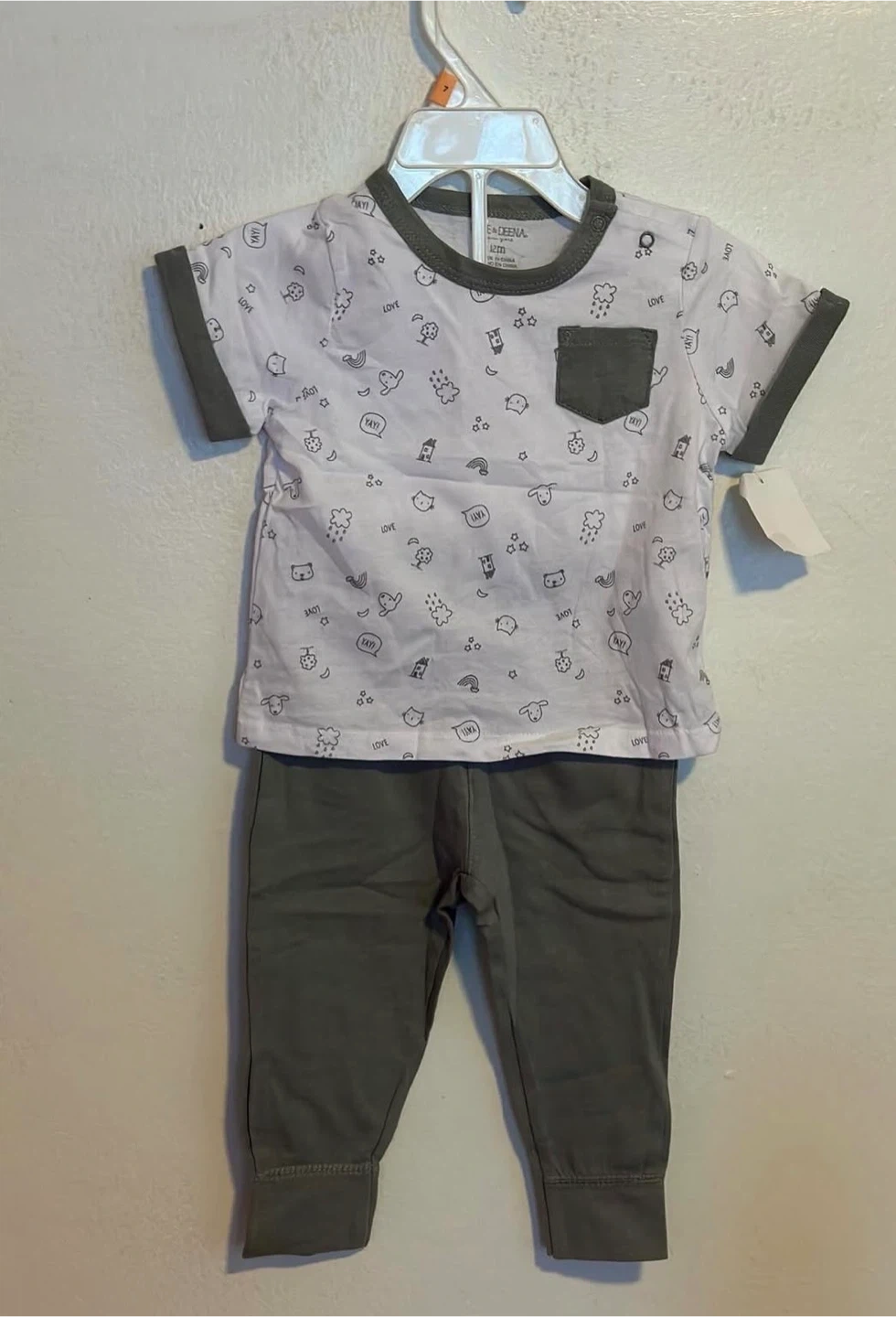 Cute E+DEENA baby outfit set in size 12 months. It's a white t-shirt with all-over playful graphics and a grey pocket, paired with solid grey pants. Perfect for everyday wear!
