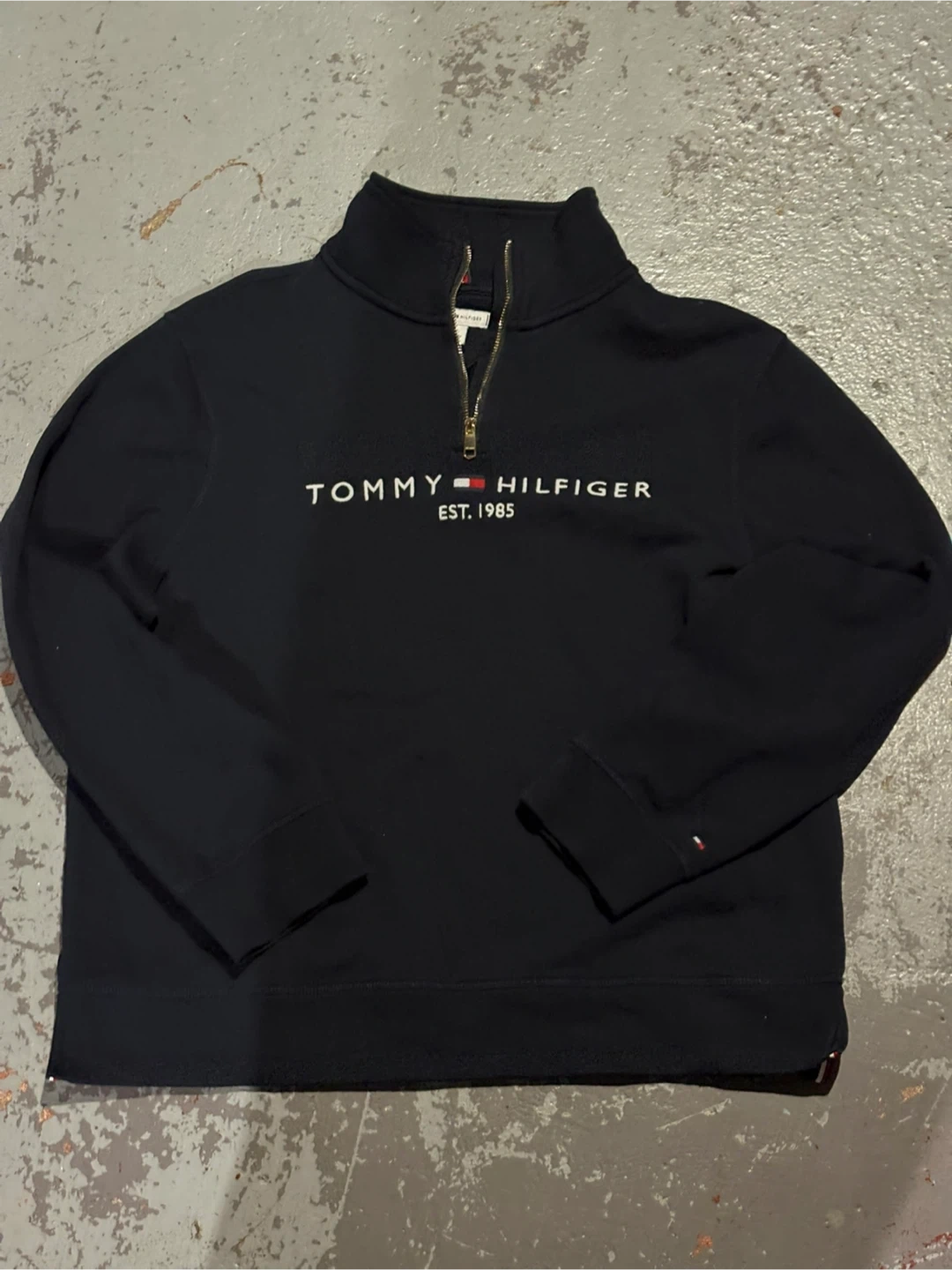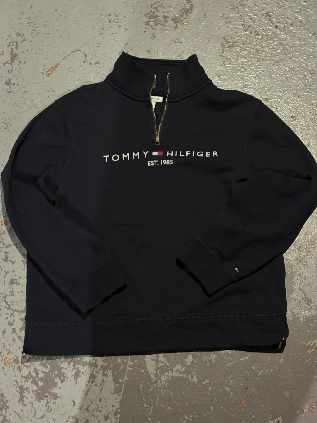 Navy blue Tommy Hilfiger sweatshirt with a quarter-zip neckline and embroidered logo. Est. 1985 detail is also visible. It's made from a comfortable fabric blend, perfect for casual wear.