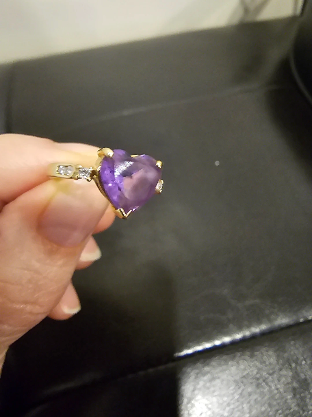 Selling a beautiful heart-shaped amethyst ring! The ring features a lovely purple amethyst stone in a heart shape, set in a gold-tone band. It has some small diamond accents on the sides of the stone. This ring would make a wonderful addition to any jewellery collection