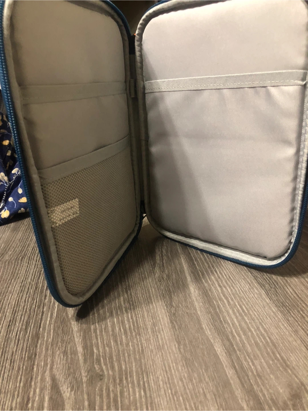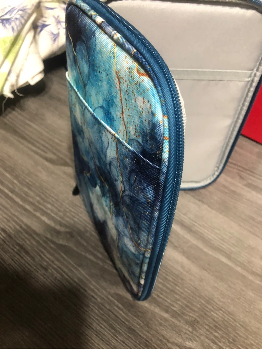 This new zippered pouch features a blue marble design with gold accents. It's got multiple elastic straps and a mesh pocket inside for organization. It's great for storing small electronics, art supplies, or travel essentials!