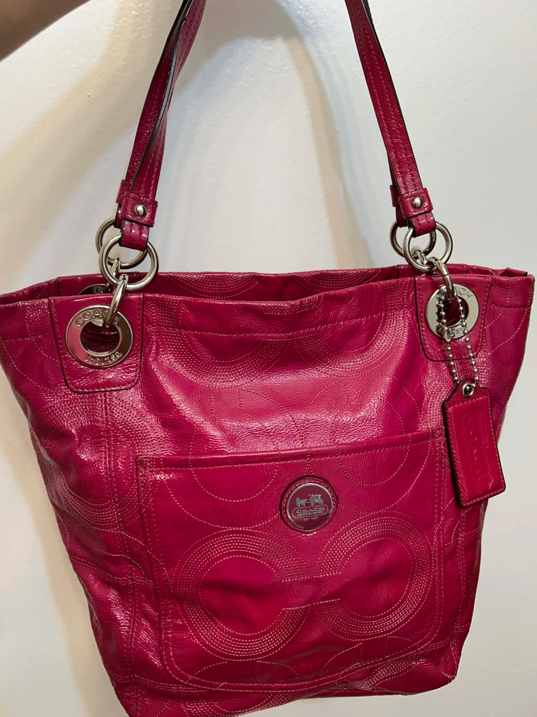 This is a vibrant pink Coach tote bag made from textured leather. It features the classic Coach logo emblem on the front. The bag has dual shoulder straps and a roomy interior for everyday essentials. It's a stylish accessory for any occasion!
