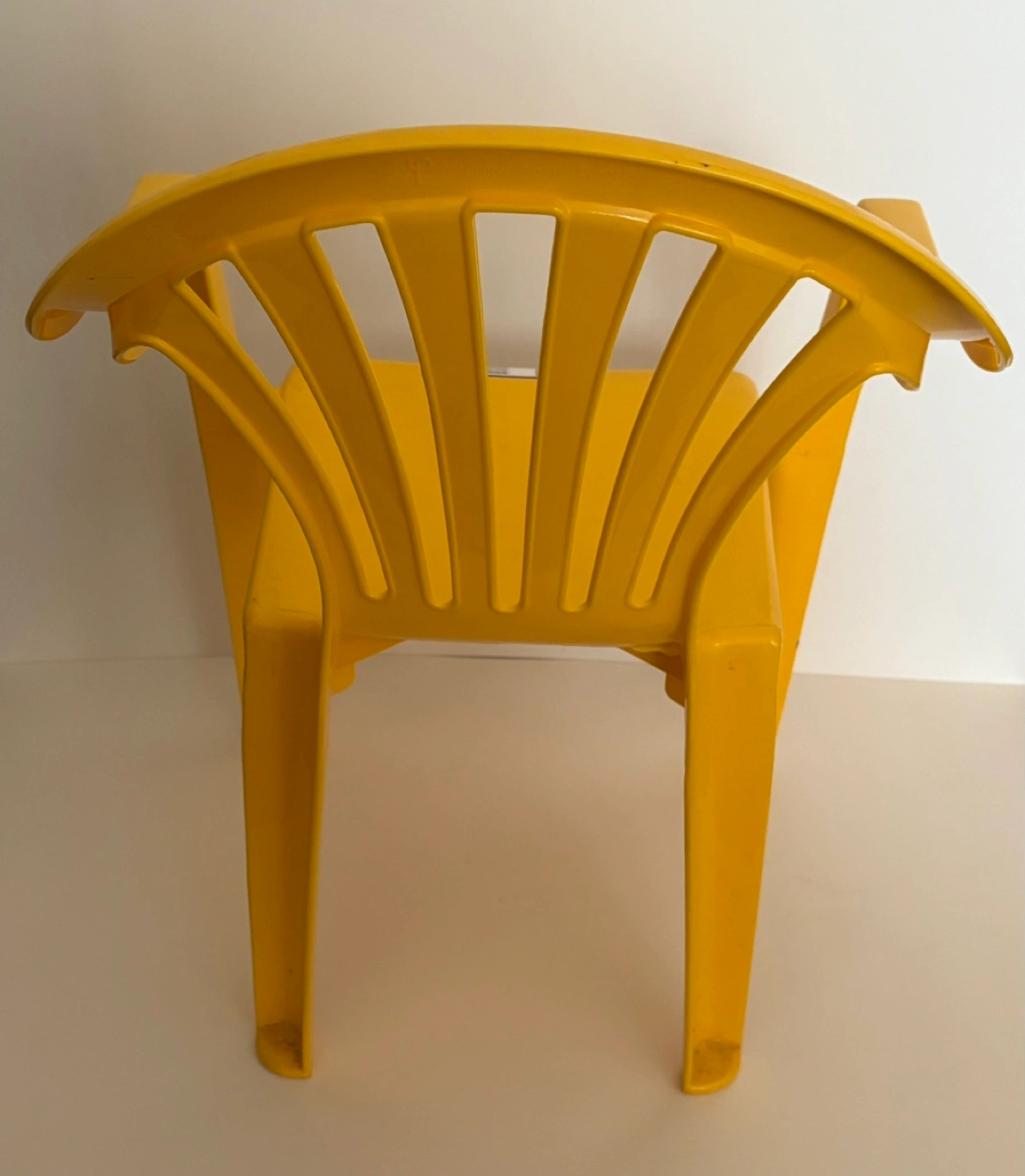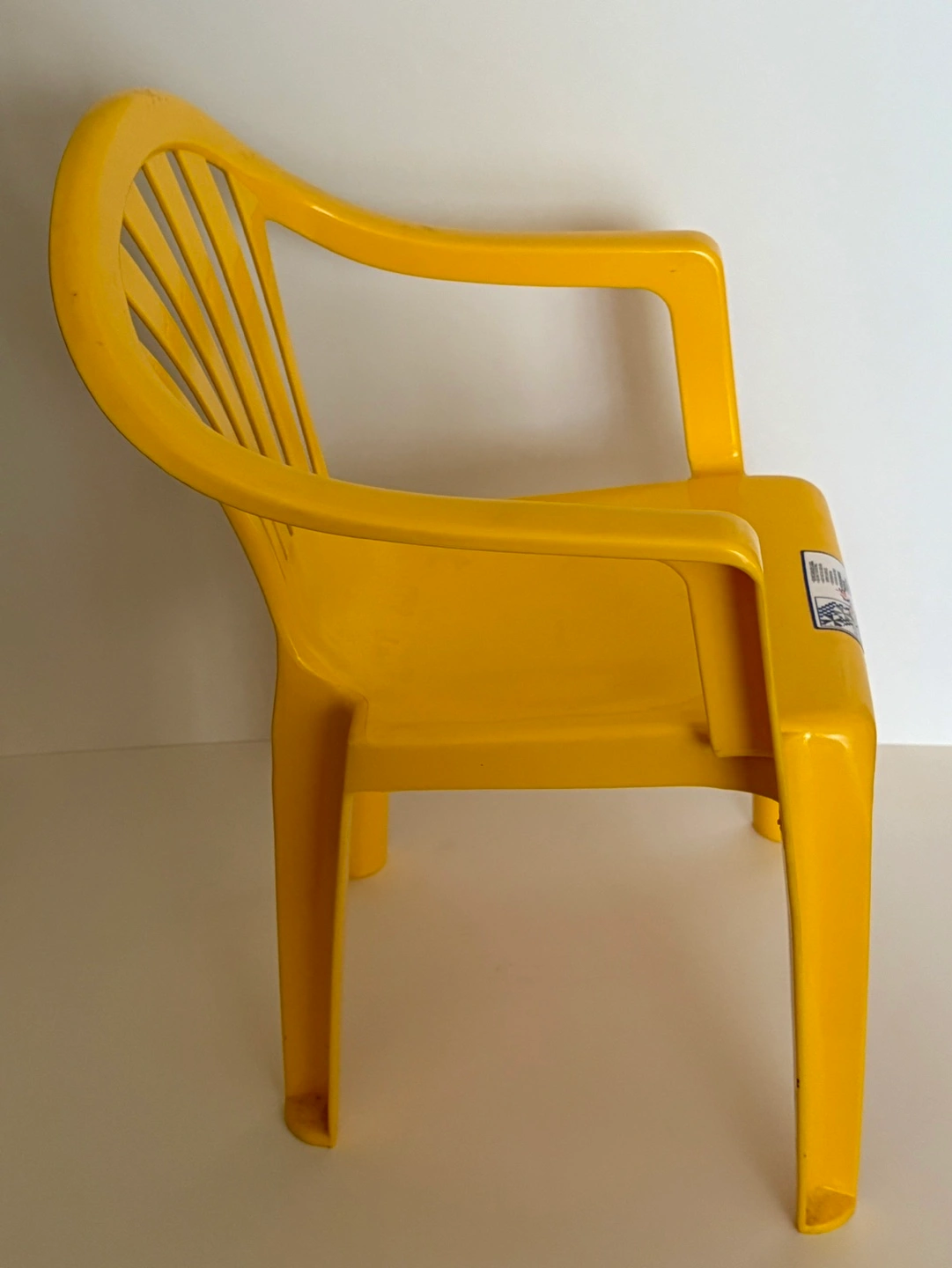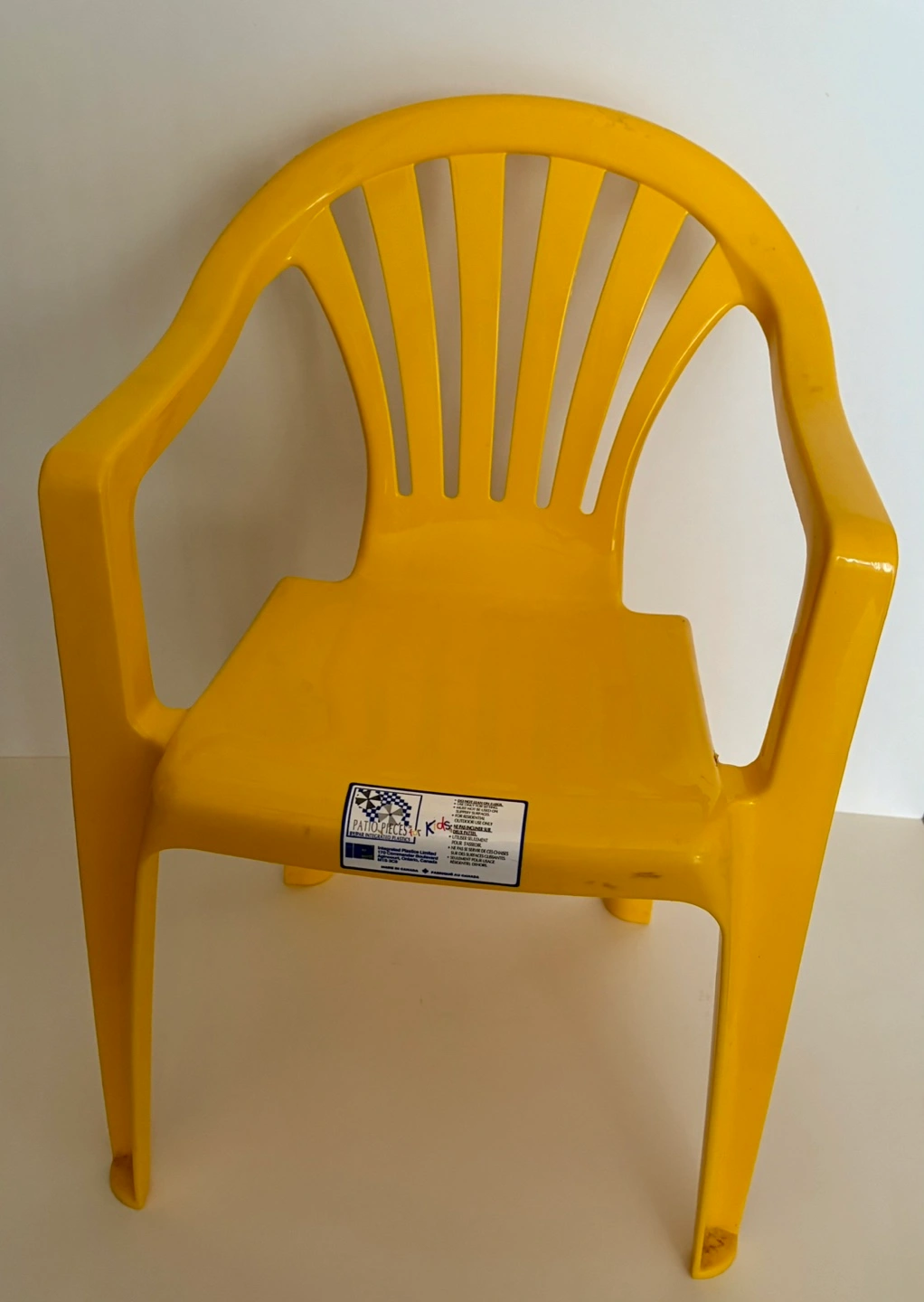 Two plastic children's chairs with armrests. Red and yellow in colour. Seat is 10” high and 10” wide. Overall height is 19.5”. Stackable and easy clean. Made in Canada. $4 each.