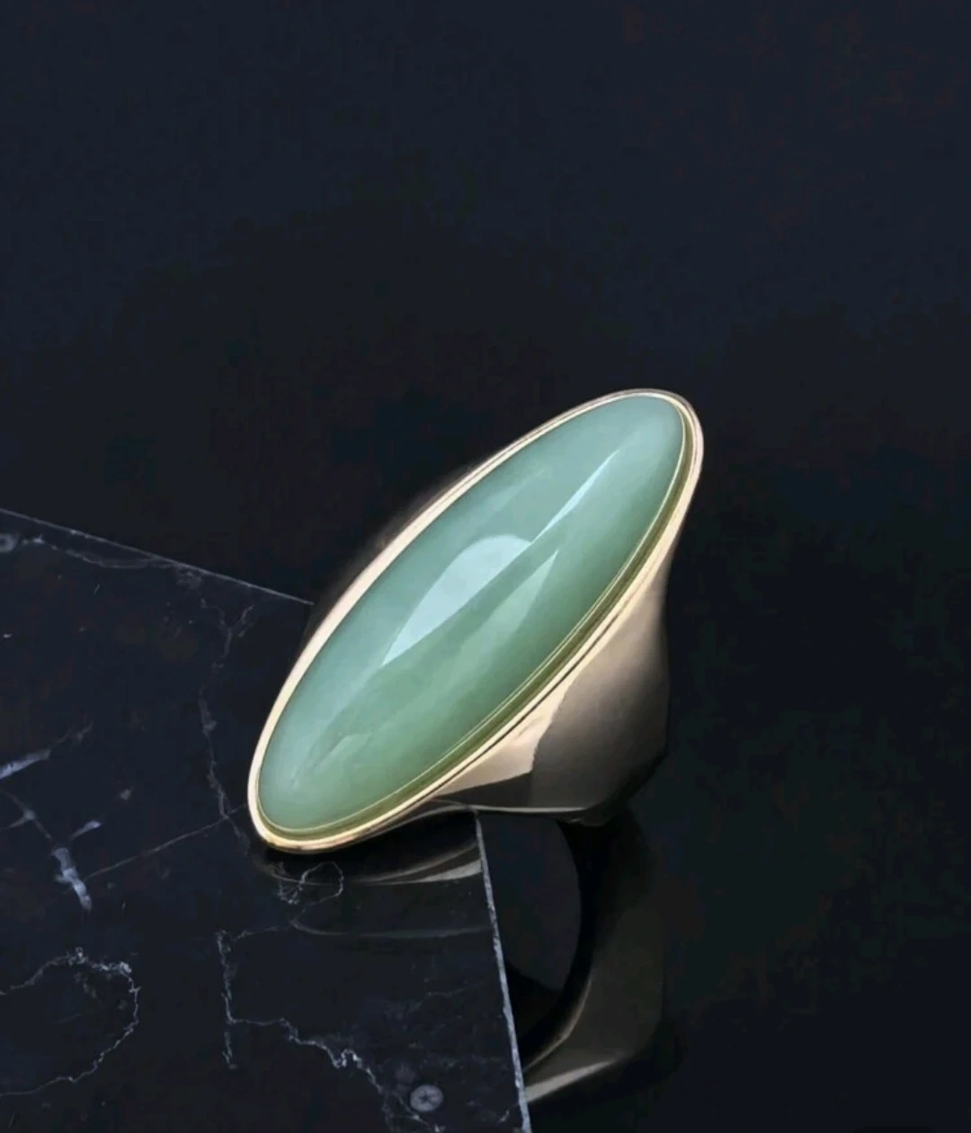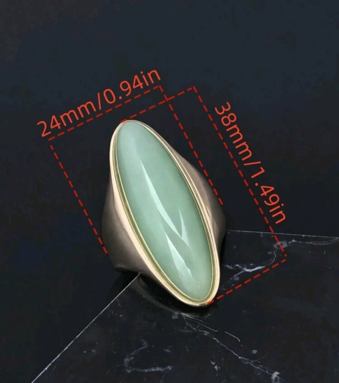 This bold ring features a large, oval-shaped green stone set in a gold-tone metal band. The stone measures approximately 38mm x 24mm (1.49in x 0.94in). It's a striking piece for any jewellery collection!