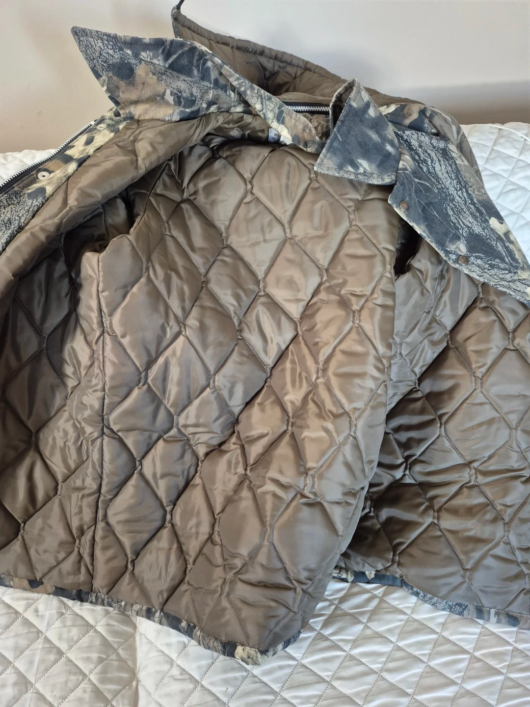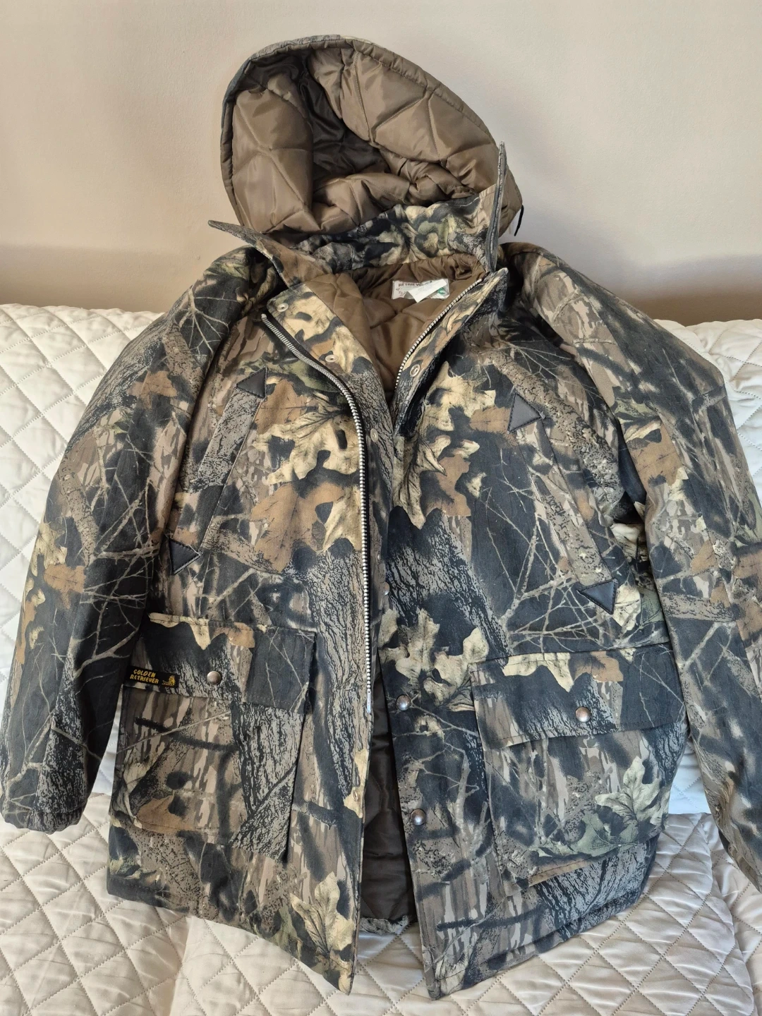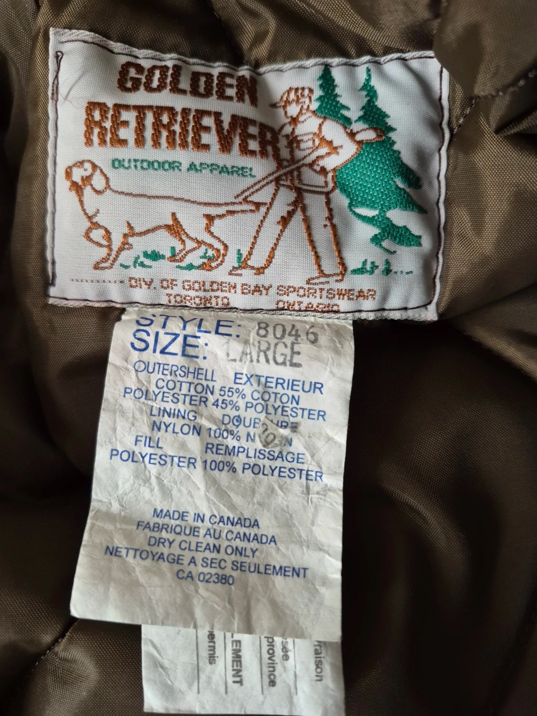 This Golden Retriever outdoor hunting jacket features a full zip front and a hood. In like new condition. Made in Canada.
