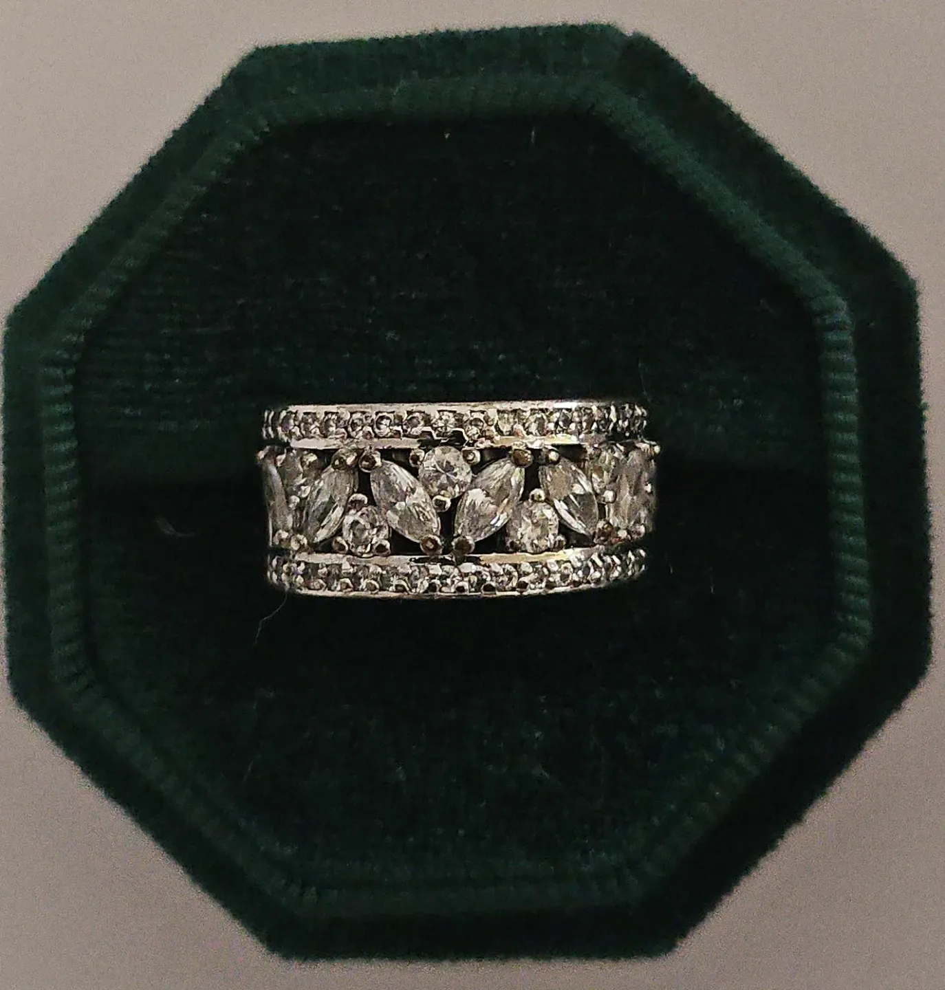 This ring features a beautiful band design with marquise and round-cut stones, surrounded by smaller accent stones. Sterling Silver Stamped