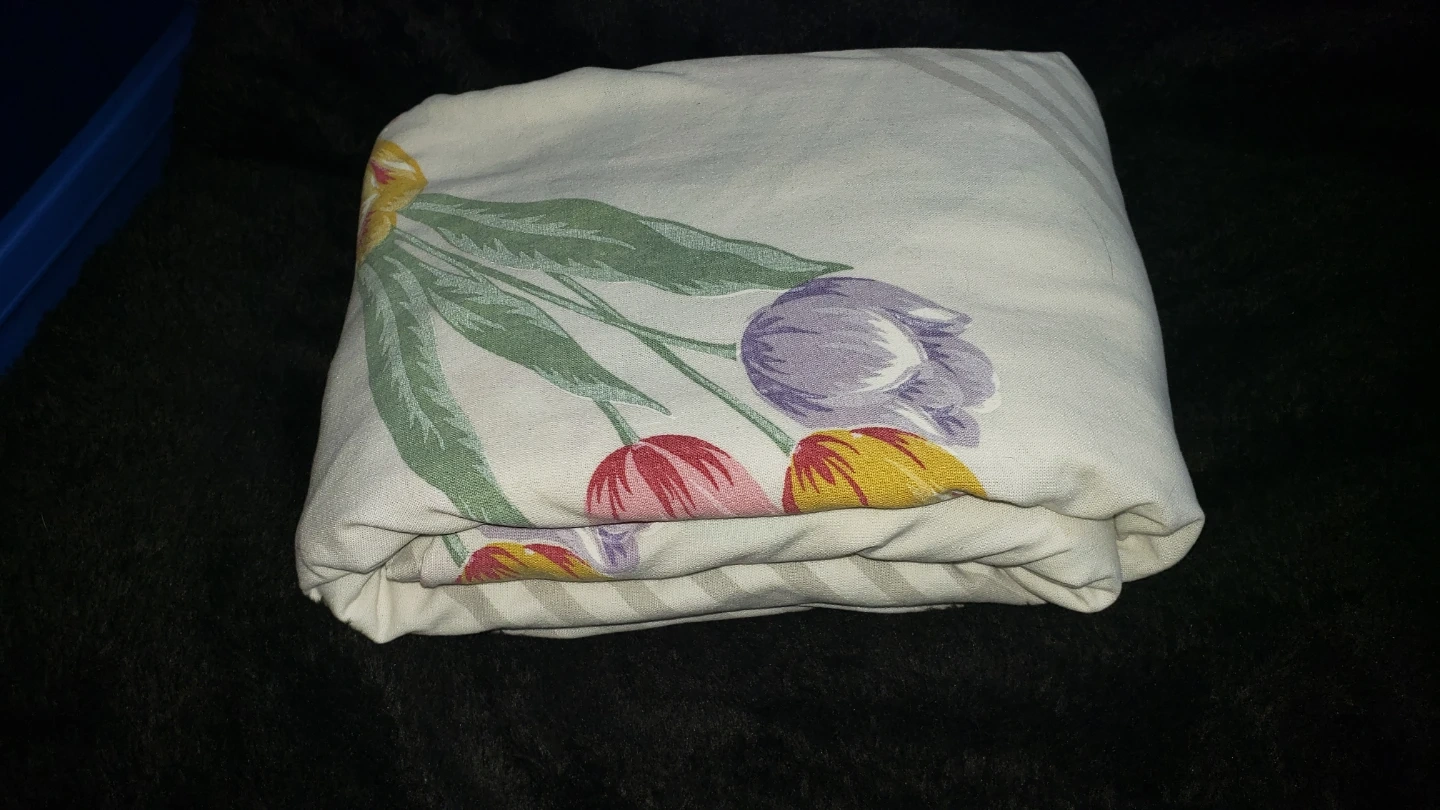 A collection of flat bed sheets featuring floral pattern, asymmetric design, and includes one sheet with tulips, another with colourful flowers, and two pillow cases with deer design . 3 queen size and 1 twin size