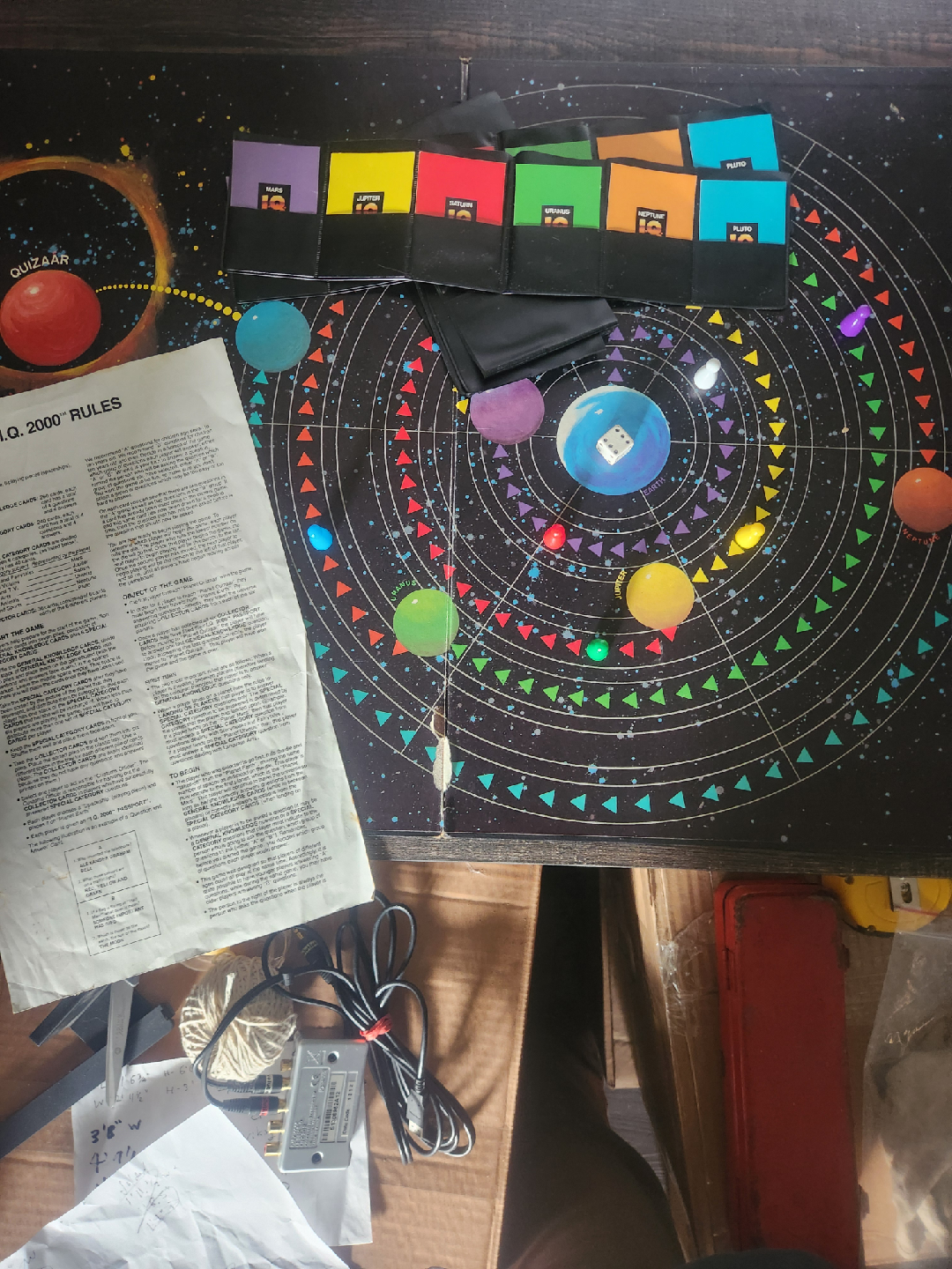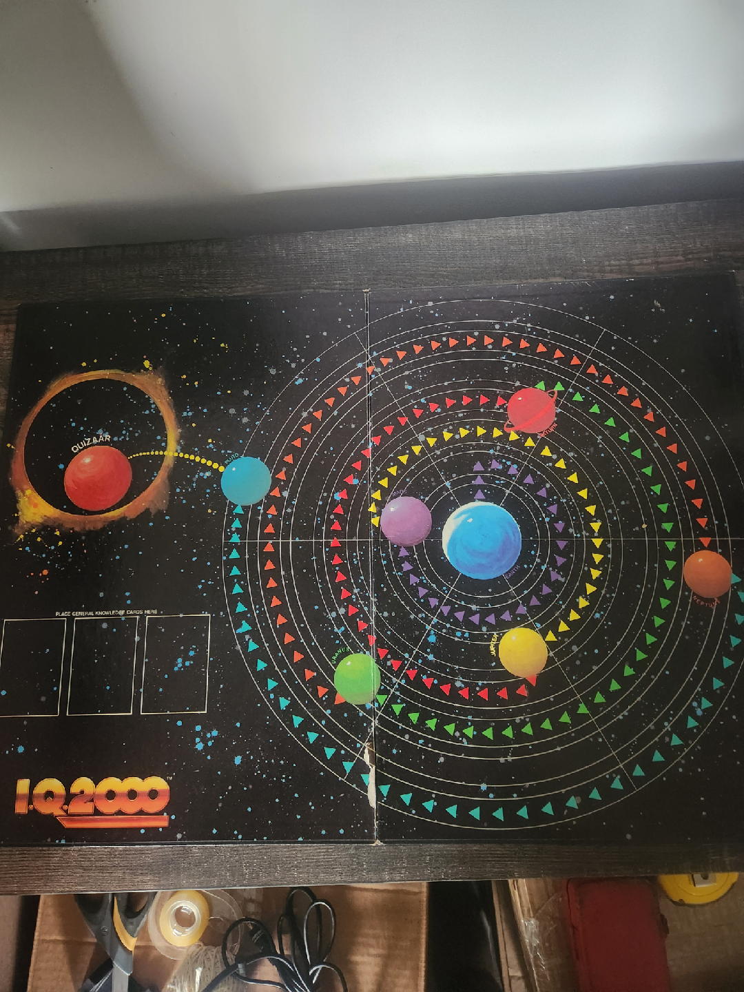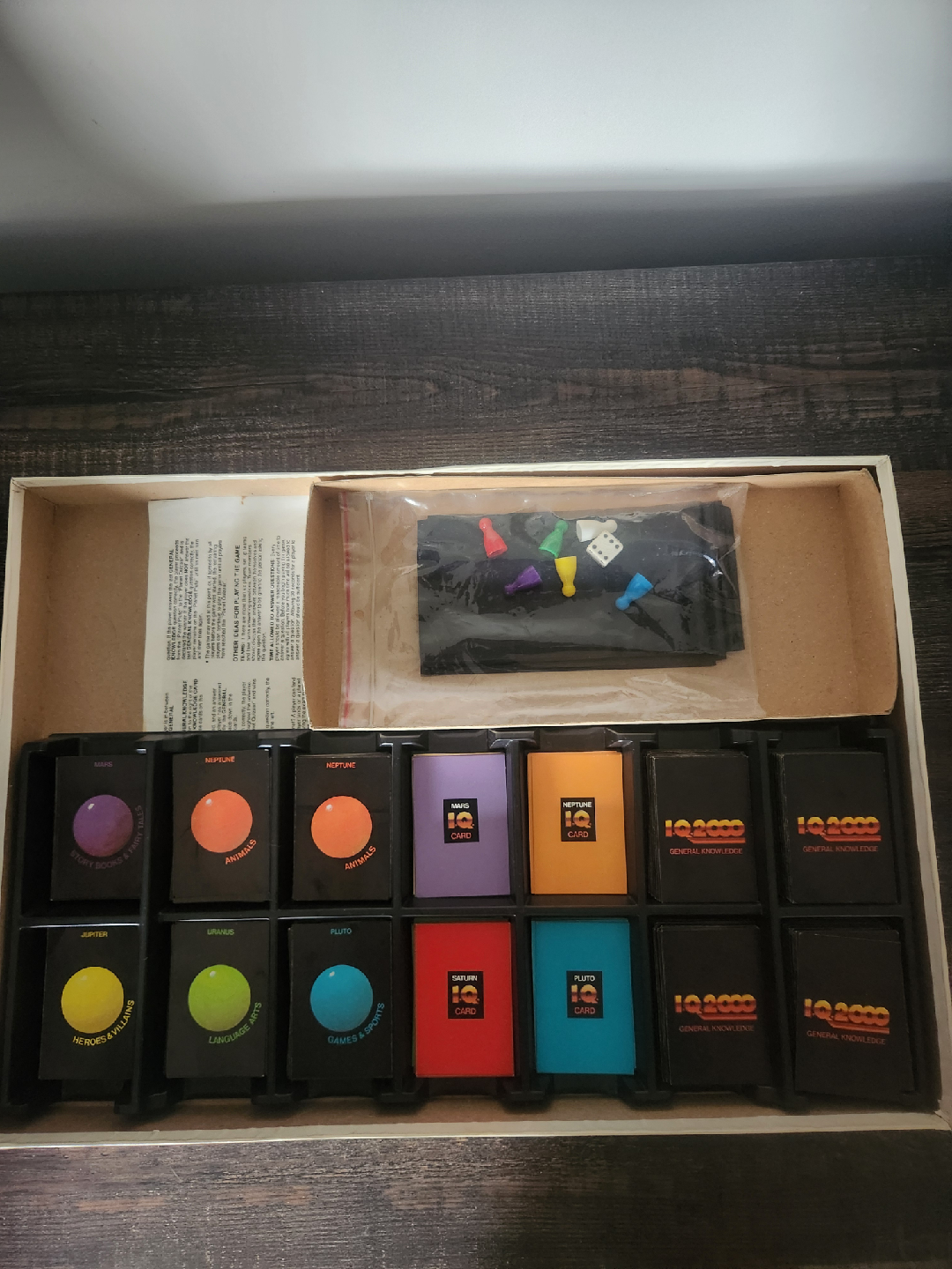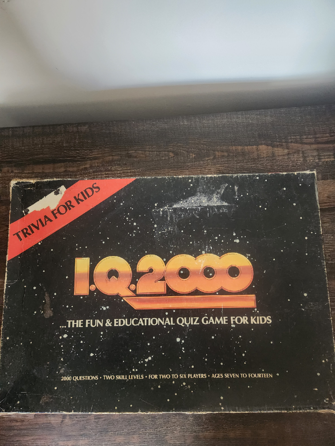 Bundled set of two classic 1980s trivia games: the original first-run Trivial Pursuit and the niche, educational I.Q. 2000 for kids. The Trivial Pursuit box shows scuffs but is pristine inside with all pieces complete. The I.Q. 2000 box is worn, but the inside is in good condition with perfect cards and a board featuring a slight tear, still fully complete. Priced low due to box condition.