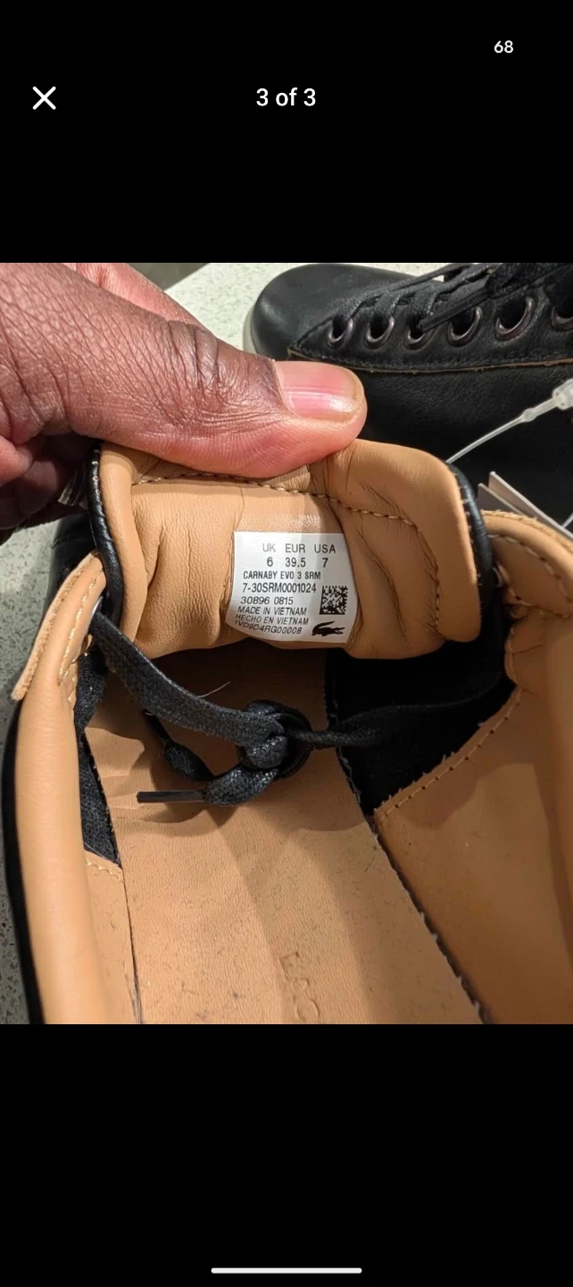 Buy & SellLacoste Carnaby EVO 3 BM1 Leather SneakersLacoste Carnaby EVO 3 BM1 Leather Sneakers$50Black leather sneakers with a tan interior and Ortholite insoles. Lace-up closure. Size EUR 39.5 / UK 7 / US M 8.5.BrandLacosteWHERE TO MEETCheck LocationView MapSELLERverifiedShelEglinton E1155 reviews0 chats·0 favorites·24 viewsSEND CHAT TO SELLERHi Shel! I’m interested in your listing.Hi Shel! I’m interested in your listing.Get the Karrot app to chatSign In to chat