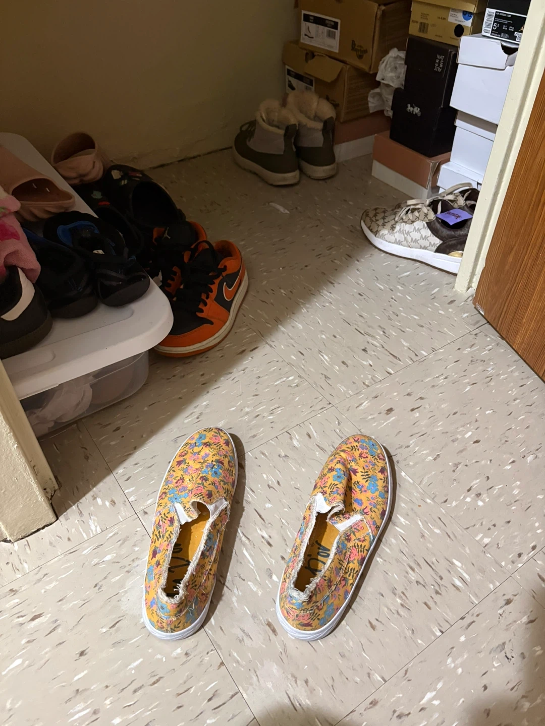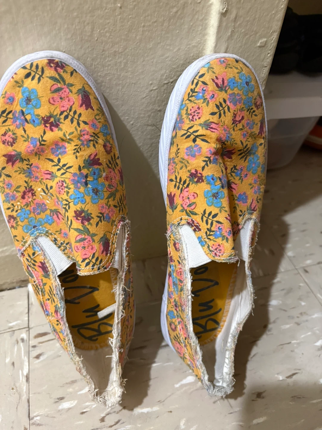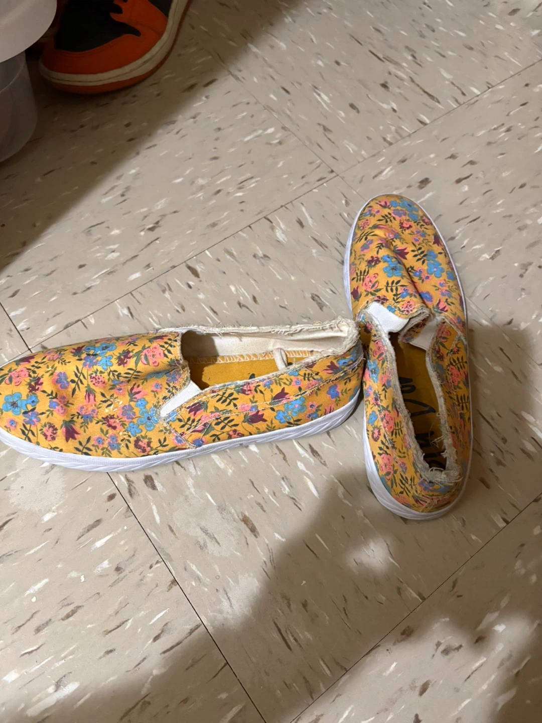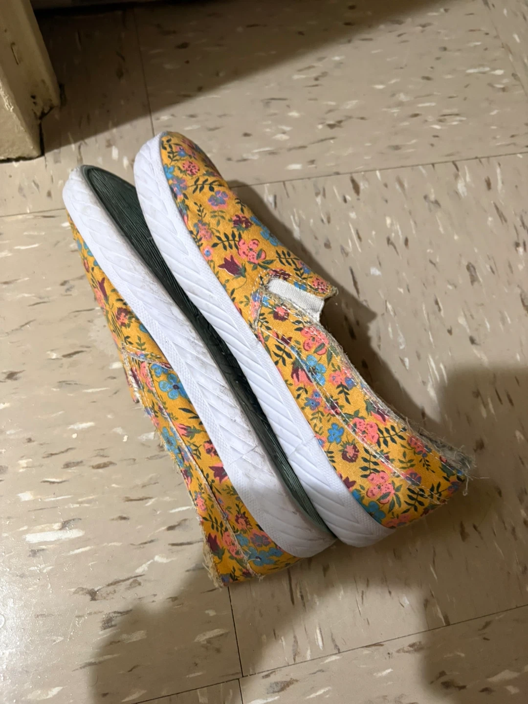 These slip-on canvas shoes feature a vibrant yellow background with a colorful floral print. They have elastic side panels for easy on and off. A comfortable and stylish choice for everyday wear!