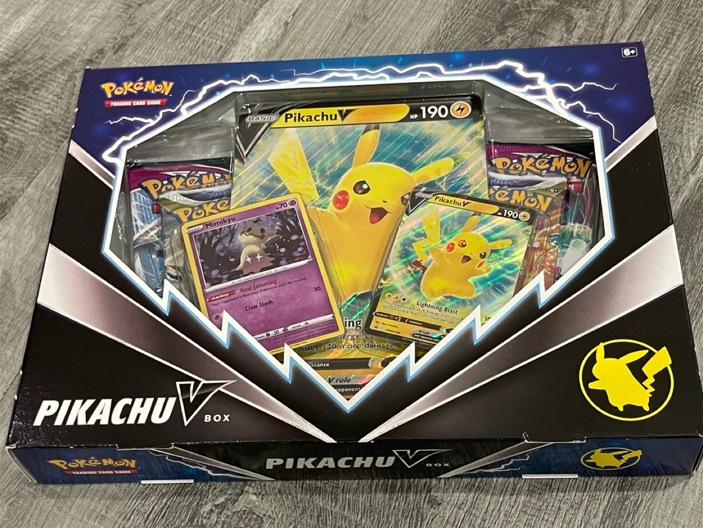 Selling a sealed, brand new Pikachu V Box from the sword and shield era. The box contains: • 1 Foil Promo Featuring Pikachu V • 1 Foil Card Featuring Mimikyu • 1 Foil Oversized Card Featuring Pikachu V • 4 Pokemon TCG Booster Packs (2x Fusion Strike and 2x Brilliant Stars) • a Code card for the Pokemon TGC Online game