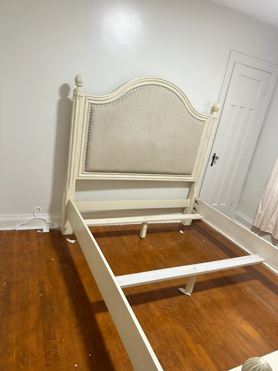 Moving out sale This is a cream upholstered bed frame with a headboard and footboard. It has decorative nailhead trim along the edges of the upholstery. The frame includes slats for mattress support. It's a queen-size bed frame.