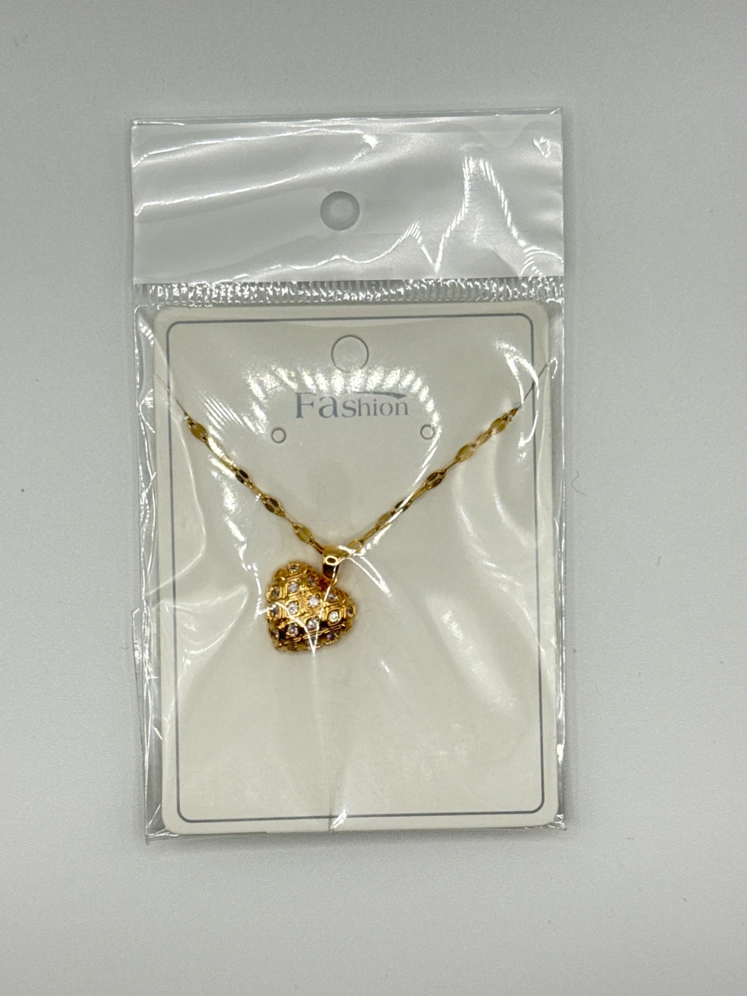 A gold-coloured necklace with a heart-shaped pendant. The pendant is decorated with small, clear stones. It's packaged in a clear plastic bag on a card. This necklace adds a touch of sparkle to any outfit!
