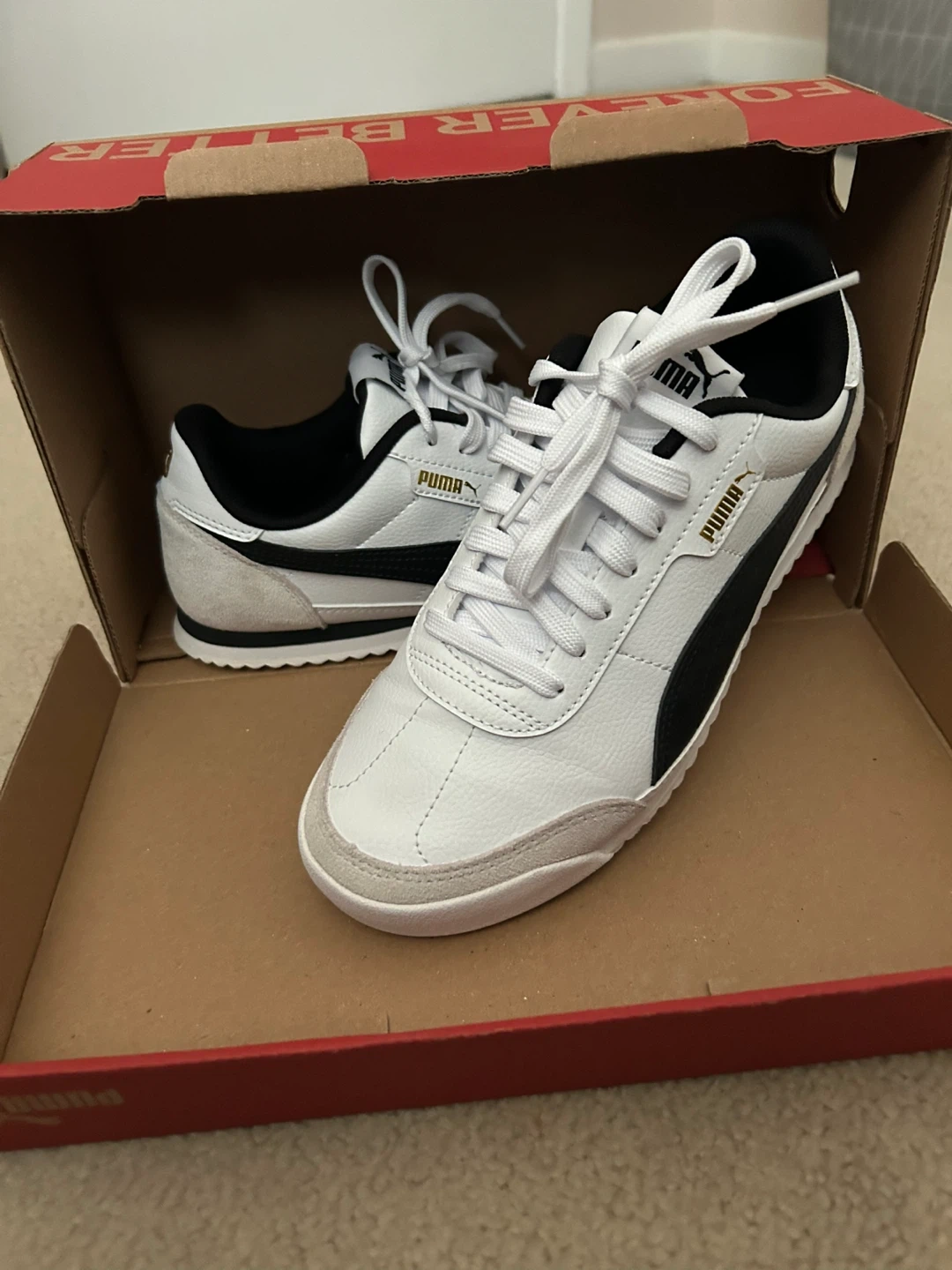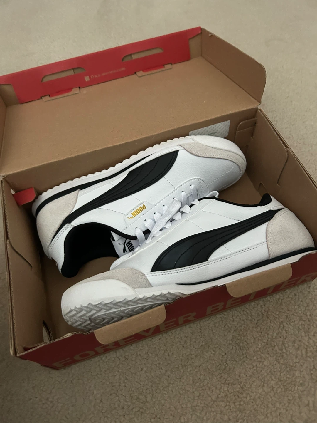 White and black Puma Torino II OG women's sneakers. These shoes are a women's regular size 7.5 US. They're made with a mix of leather and suede for a classic look.