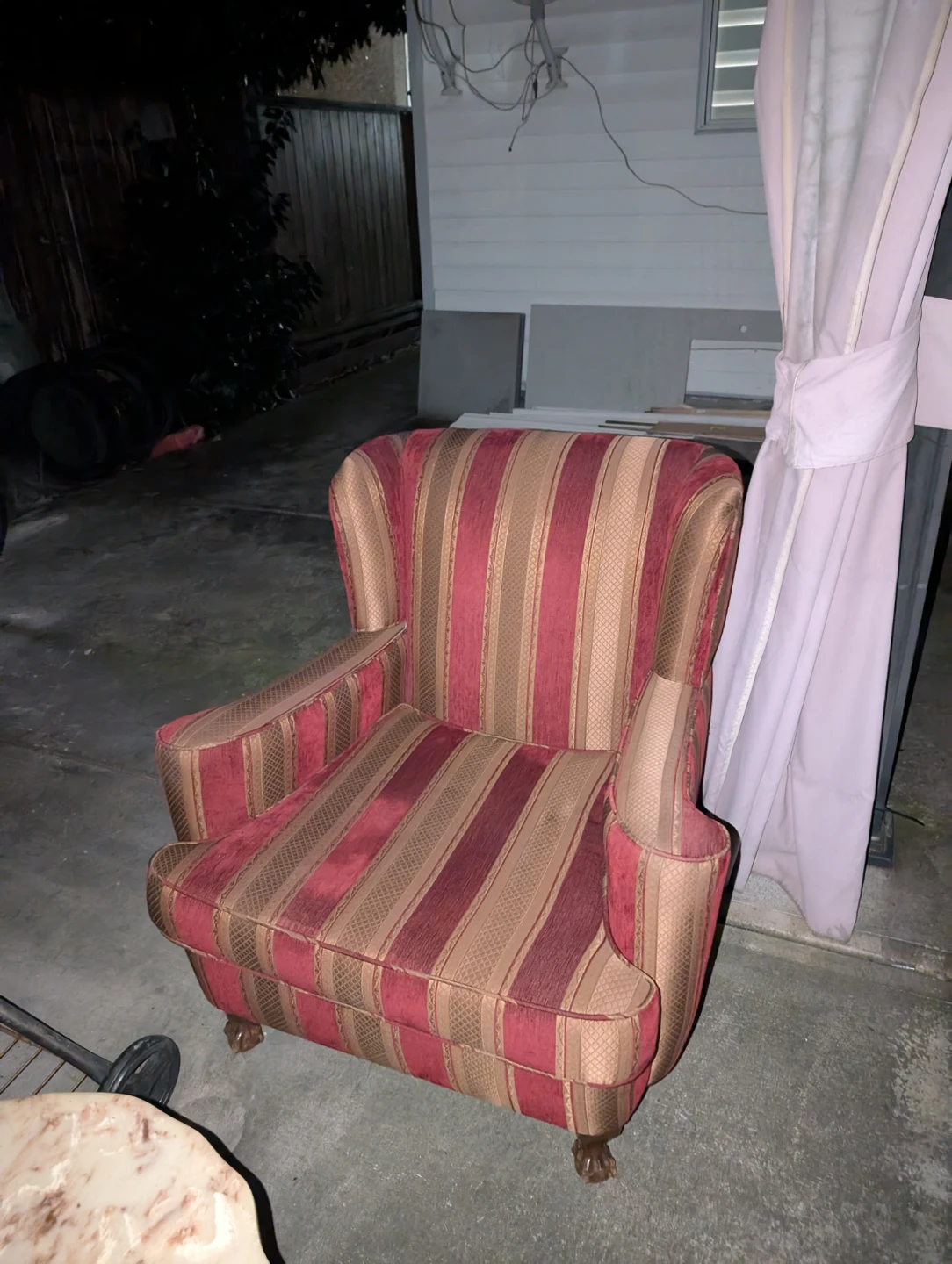 A lovely accent chair featuring a classic red and gold stripe pattern. This chair's upholstered design makes it a stylish addition to any living space. It has a comfortable seat and supportive back. Looks even more beautiful in person ๐.