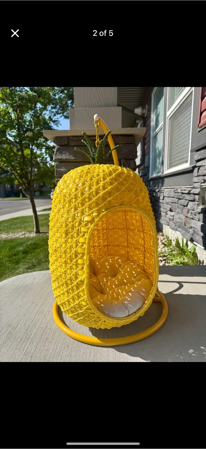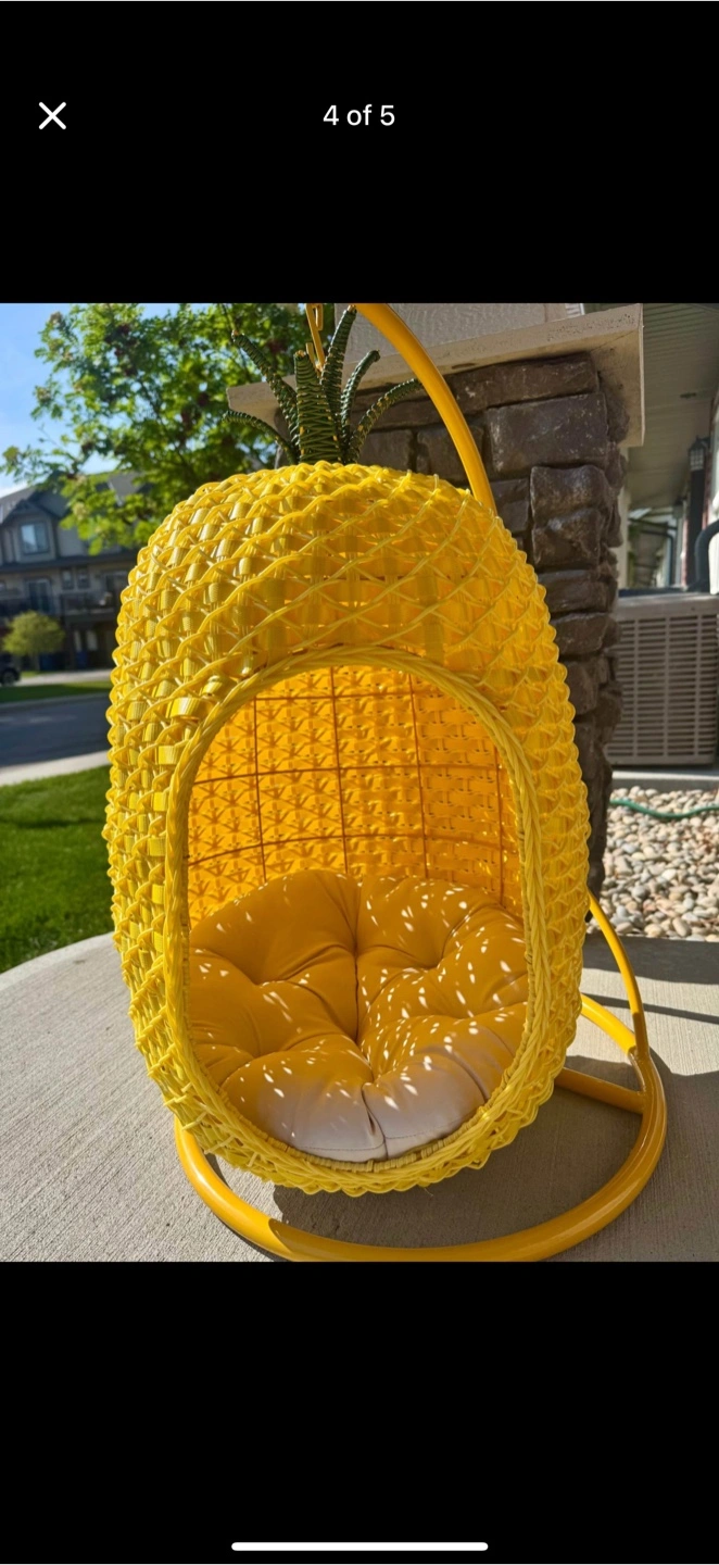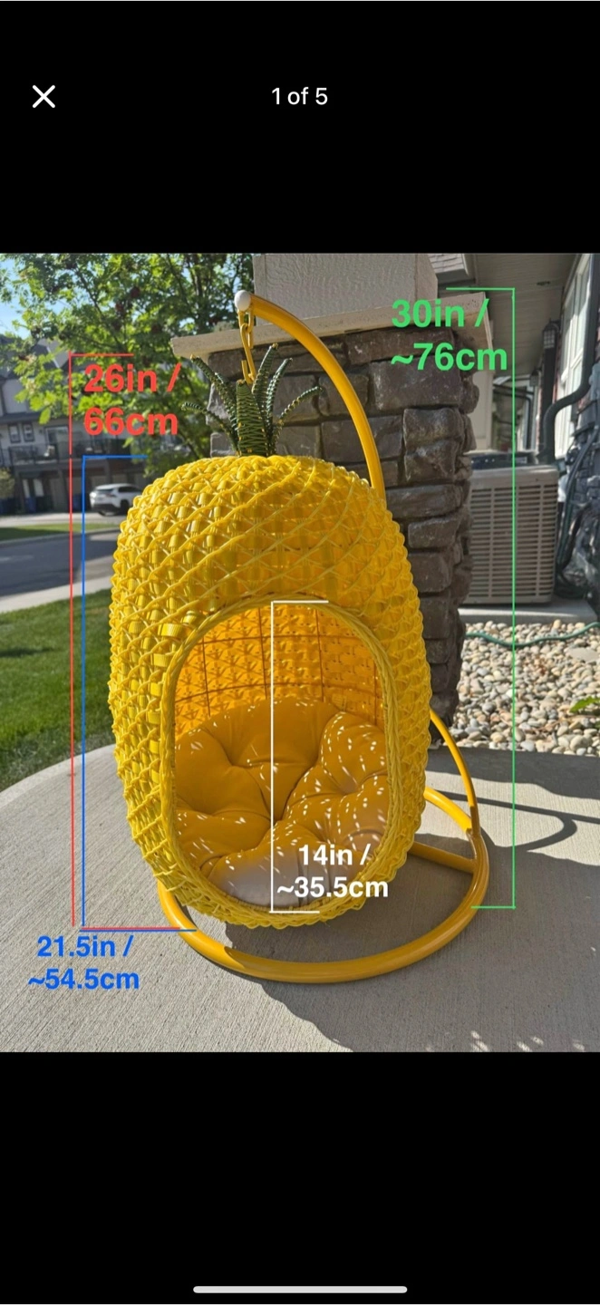 56This adorable pineapple pet bed is perfect for your furry friend! The bed is yellow and measures approximately 36 inches tall, 21.5 inches wide, and 30 inches deep. The interior cushion is about 14 inches from the base of the opening.