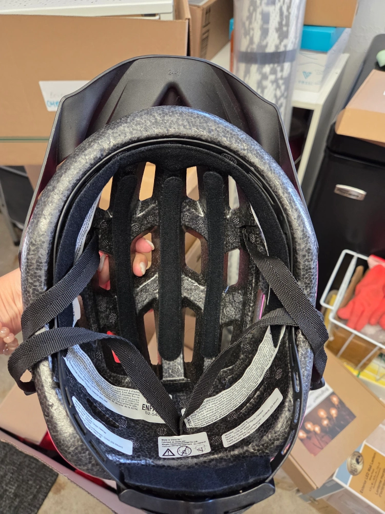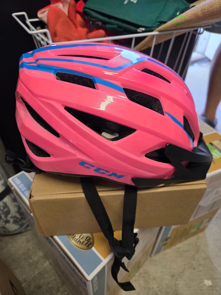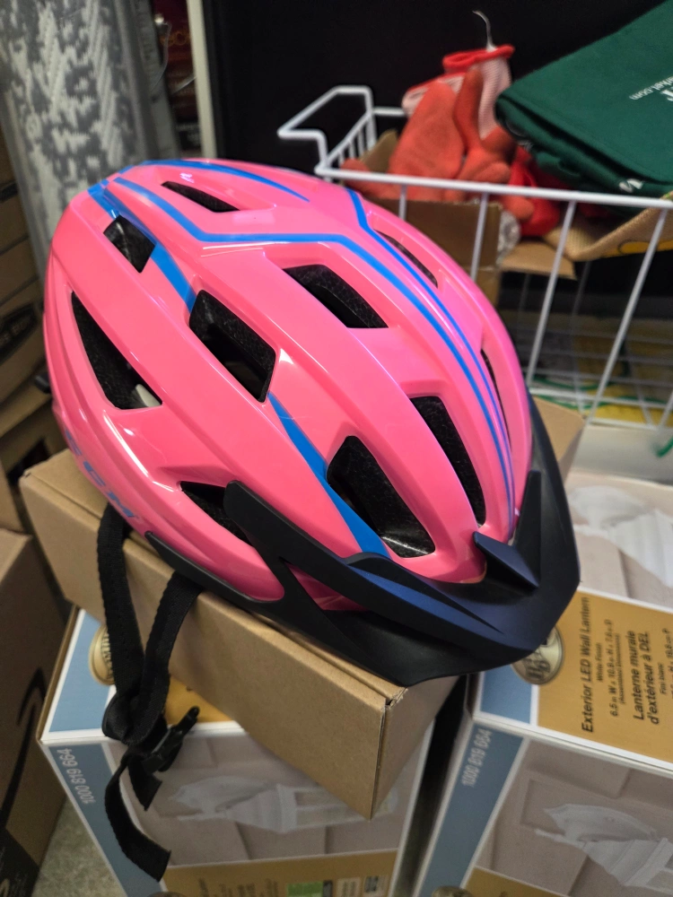 25A bright pink bike helmet. Blue accent stripes along the top. Black visor. Offers a sense of security while riding your bike. Pick up only from 67th and Oak Street (Chevron).