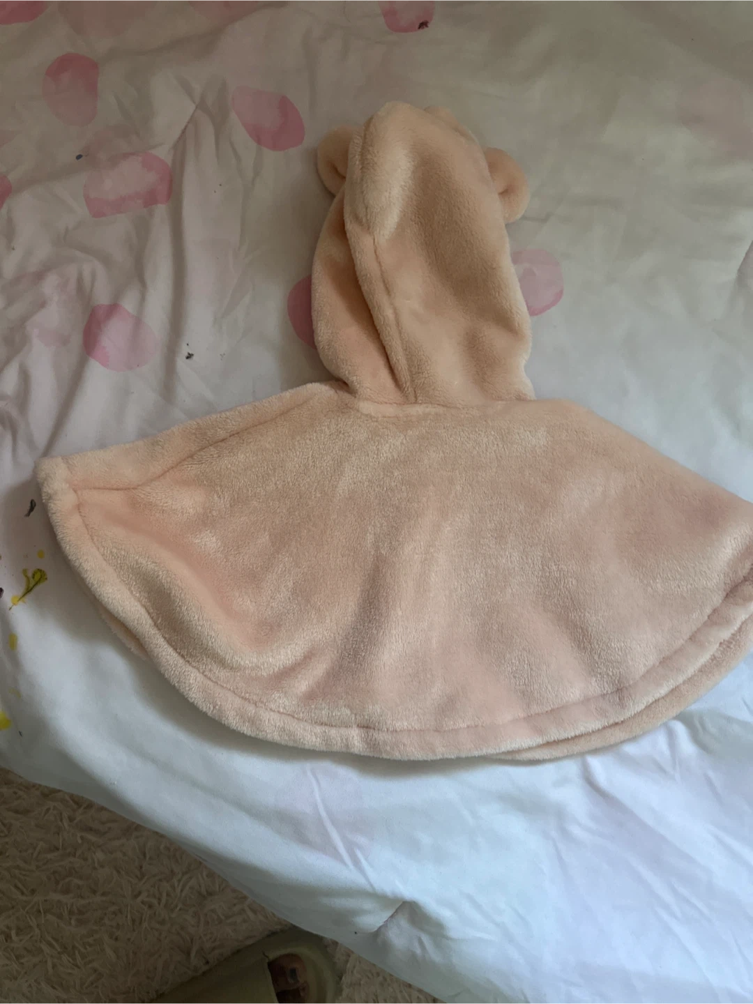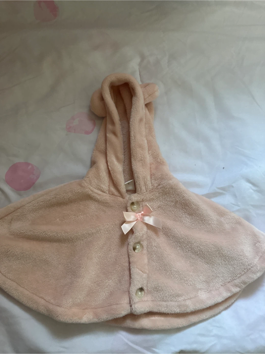 12This adorable pink hooded cape is perfect for keeping your little one cozy! It features a cute bear ear design on the hood and a sweet little bow on the front. It's in great condition and ready for a new home