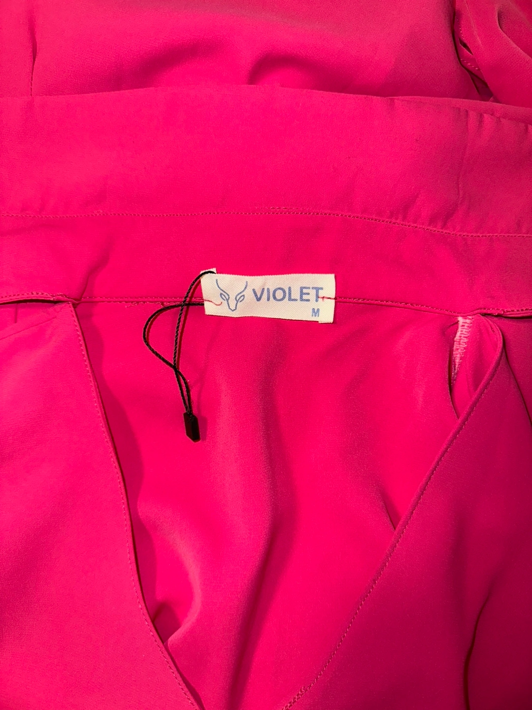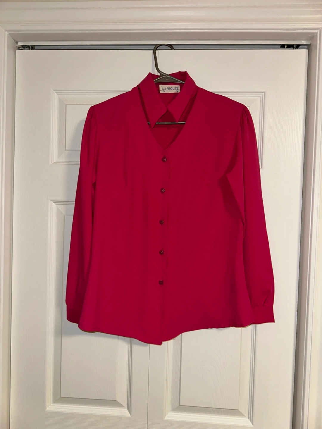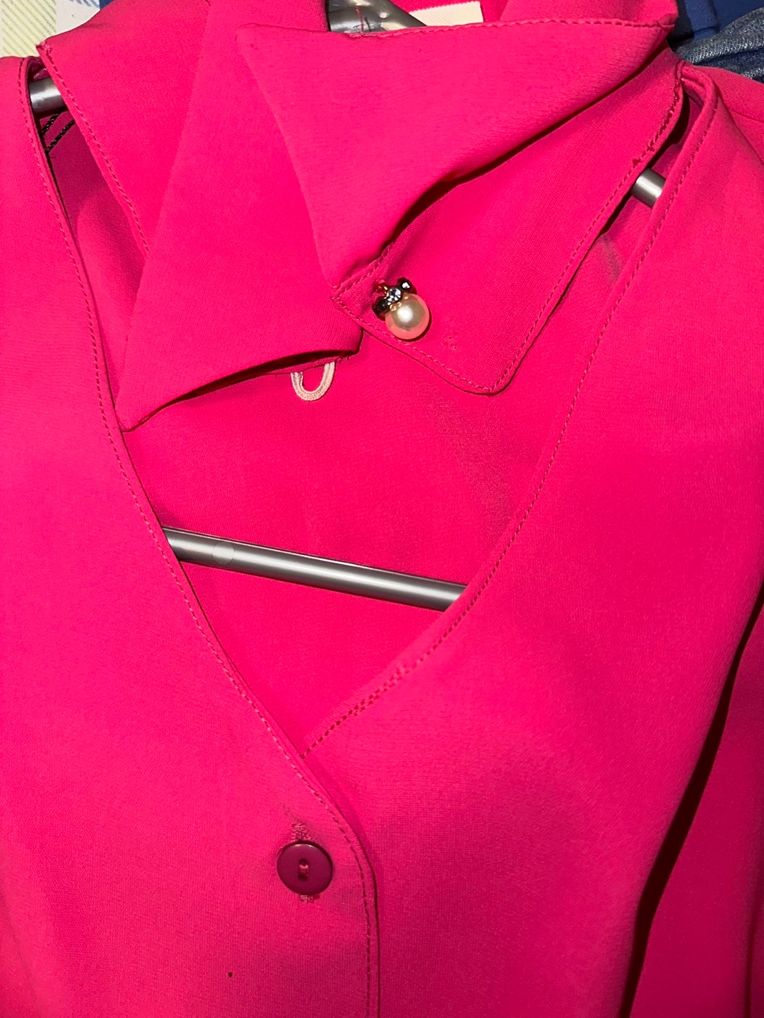 83Long-sleeved pink blouse with a unique collar and button closure.