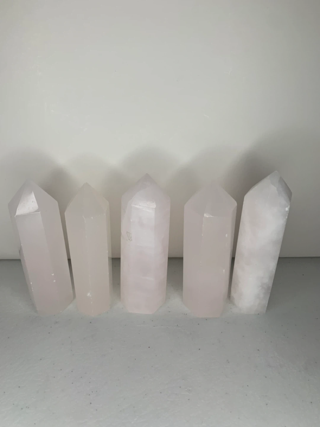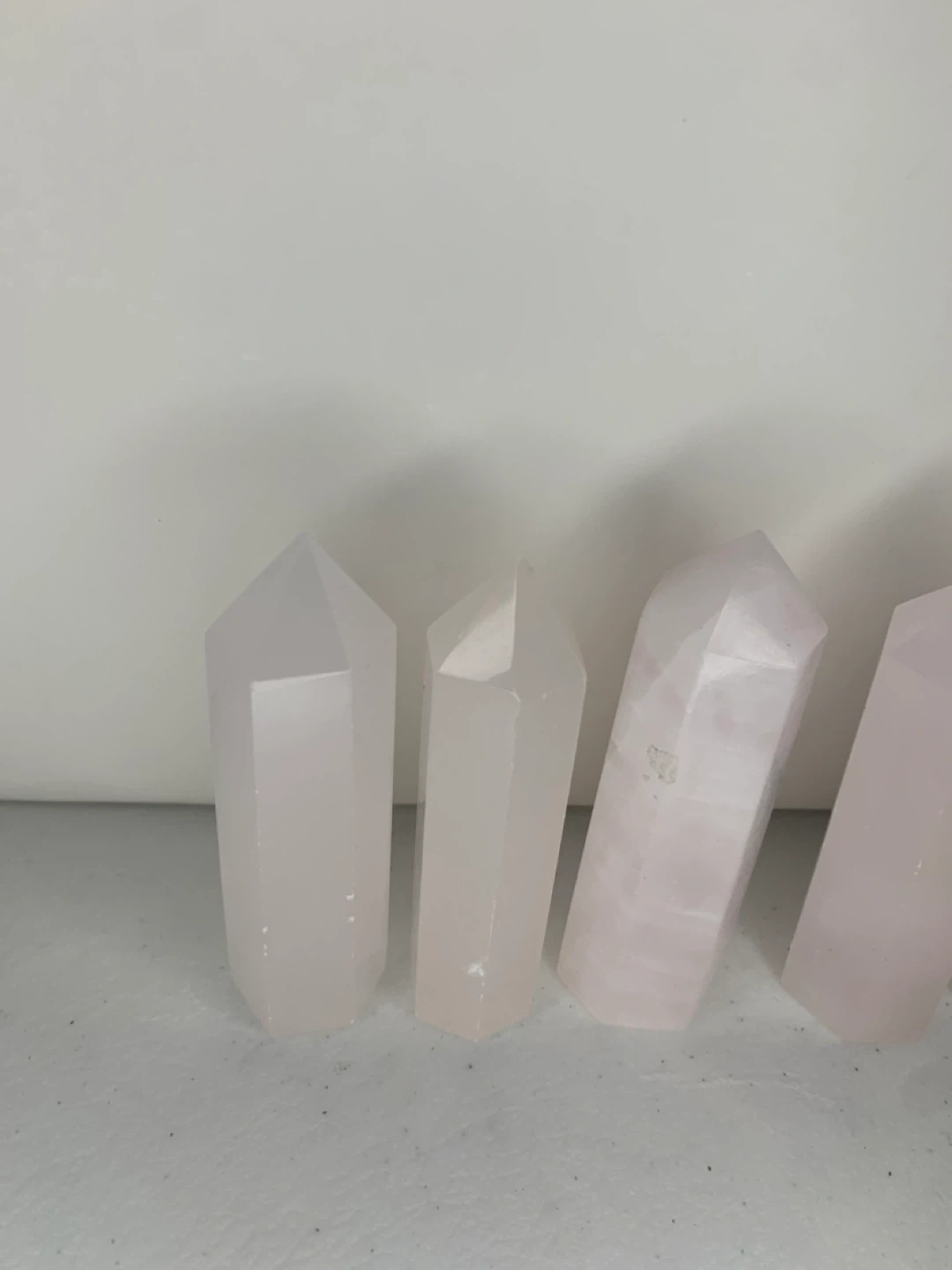 Selling a set of five beautiful pink calcite crystal points. These are perfect for adding a touch of serenity to your space or for use in crystal healing practices. They have a lovely soft pink hue and each one is unique in its shape and markings