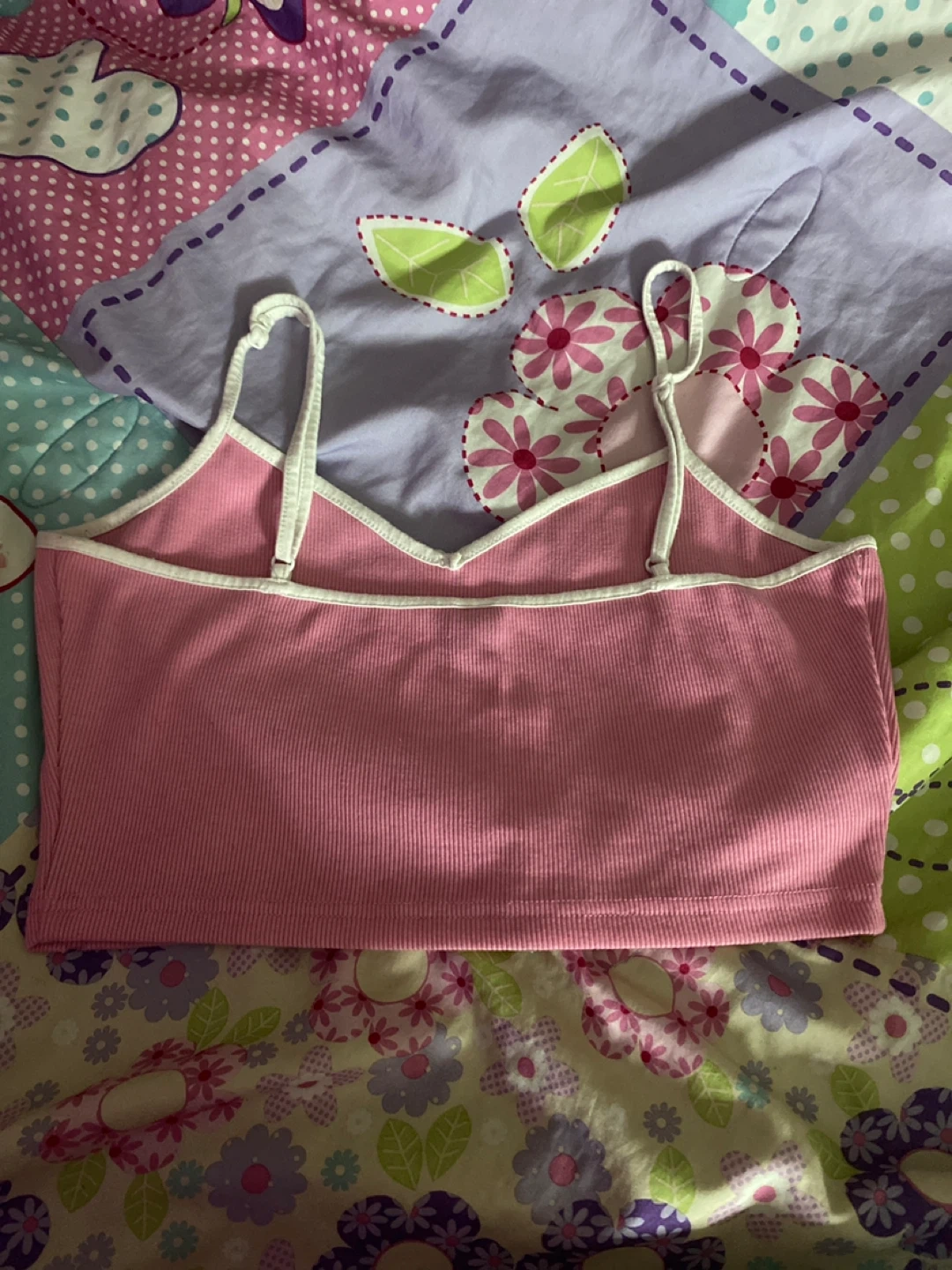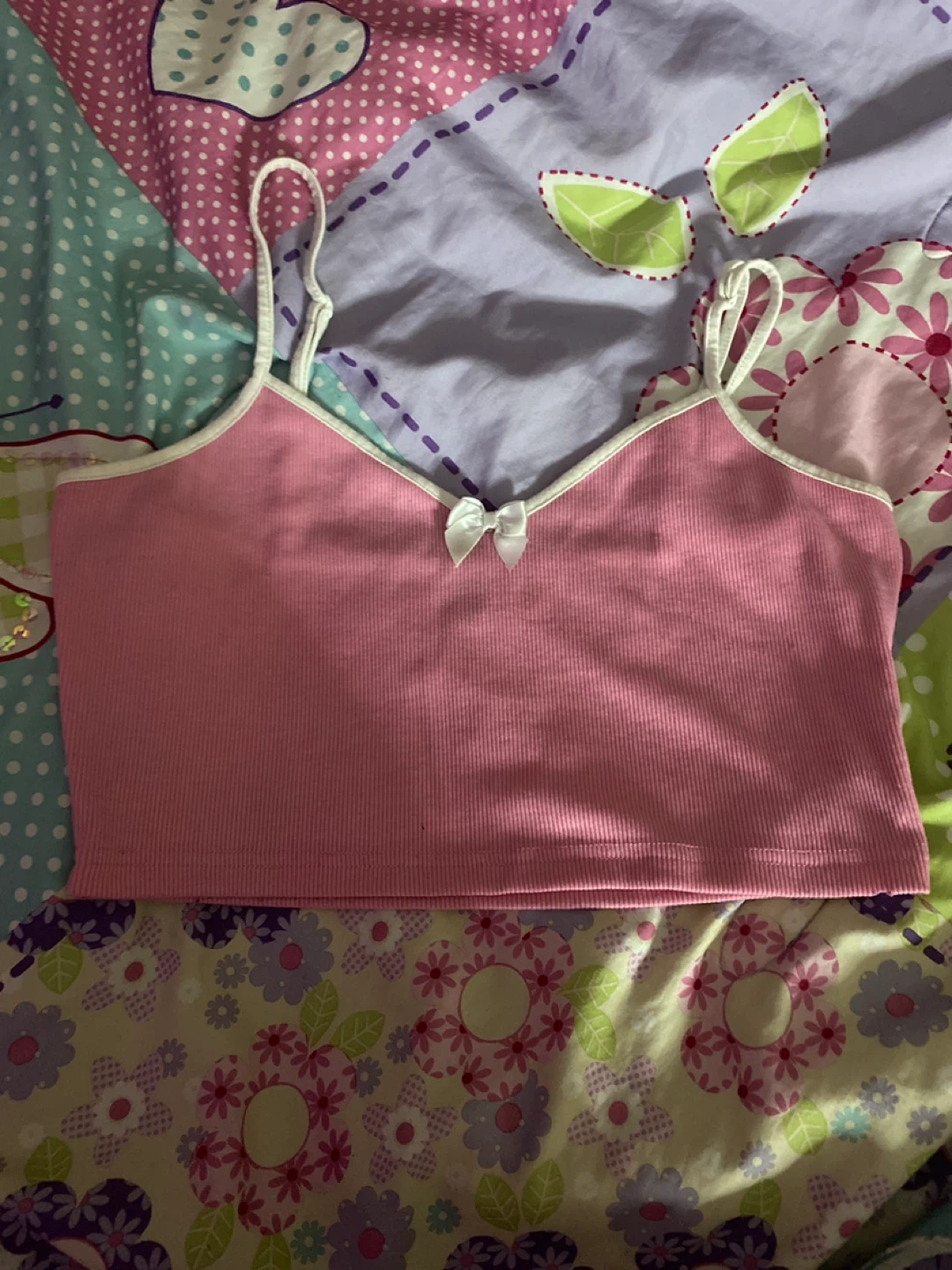 A cute pink cami top! Perfect for summer or layering. It has a white trim and a little bow. It's in great condition and ready for a new home