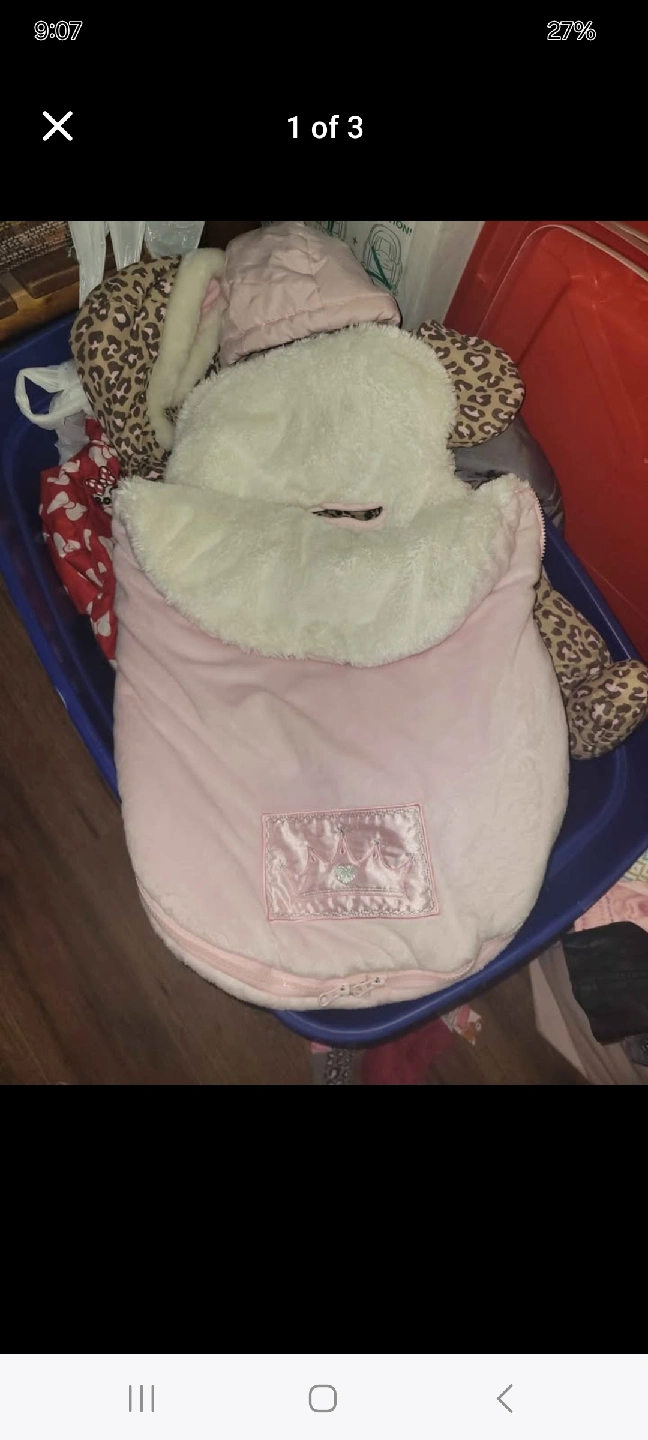 Selling a super cute pink baby bunting bag! It has a sweet little crown detail on the front. Perfect for keeping your little one cozy and warm during those chilly Canadian days. It's in great condition and ready for a new home