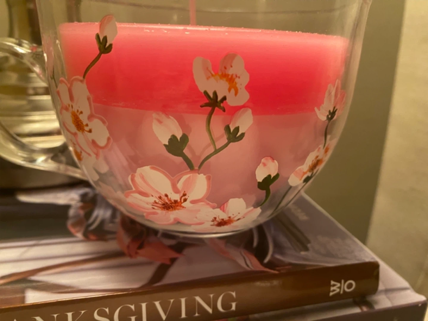 18Selling a cute pink candle in a clear glass tea cup! It has a lovely cherry blossom design around the cup. Perfect for adding a touch of floral to your home decor