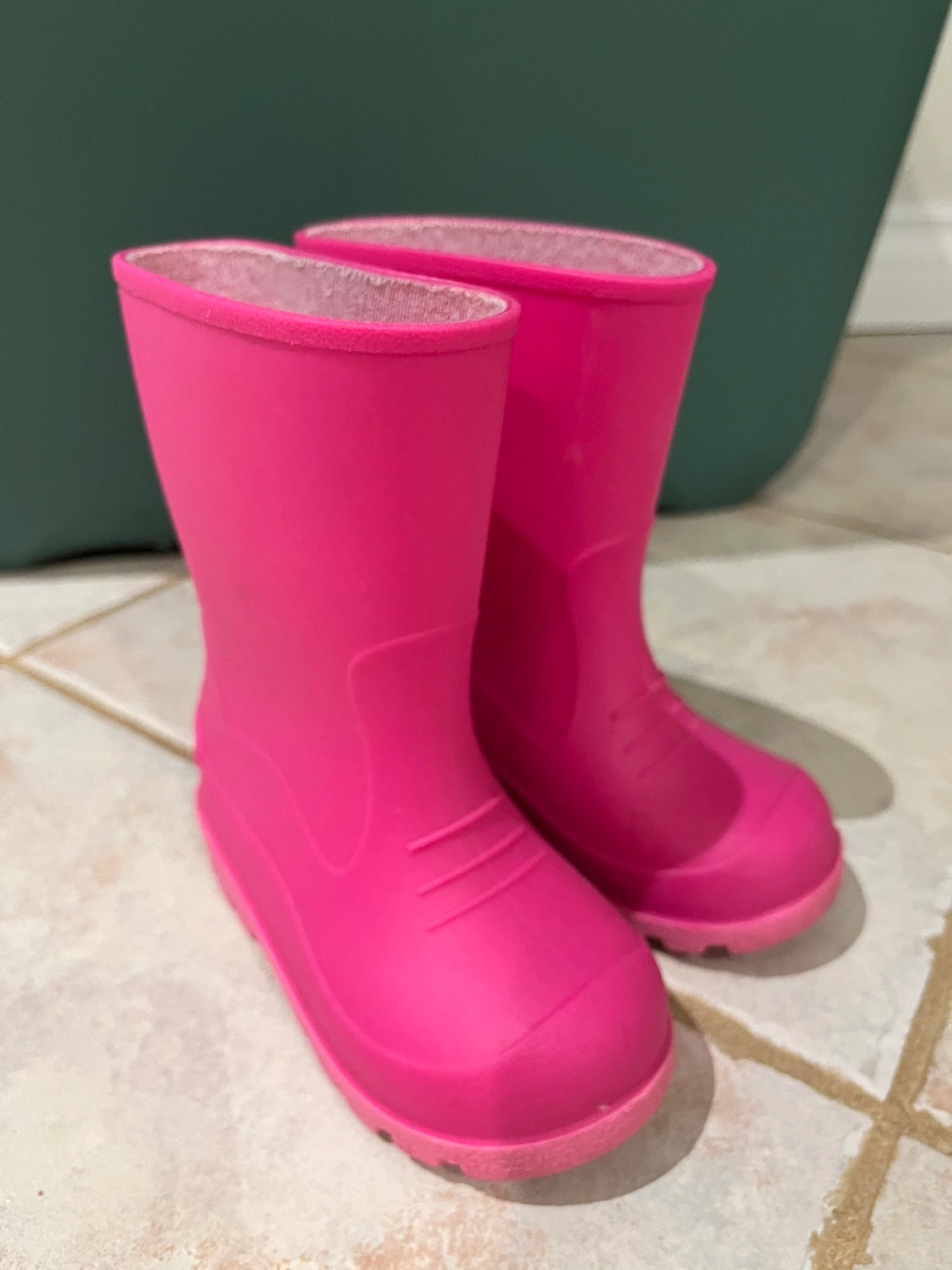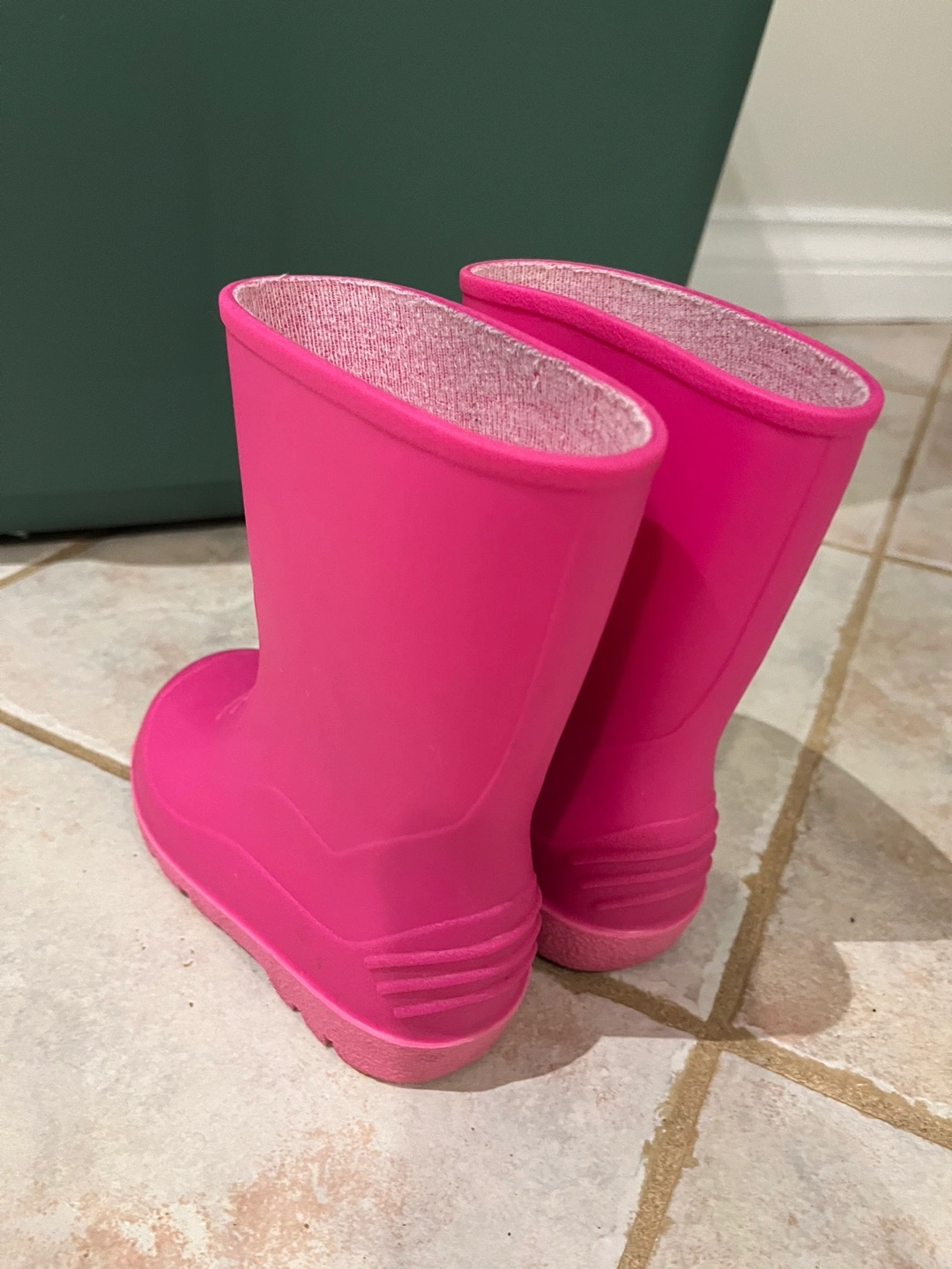 Adorable pink rain boots. Great for puddles and rainy days. Easy to clean. Soft interior. Practically new