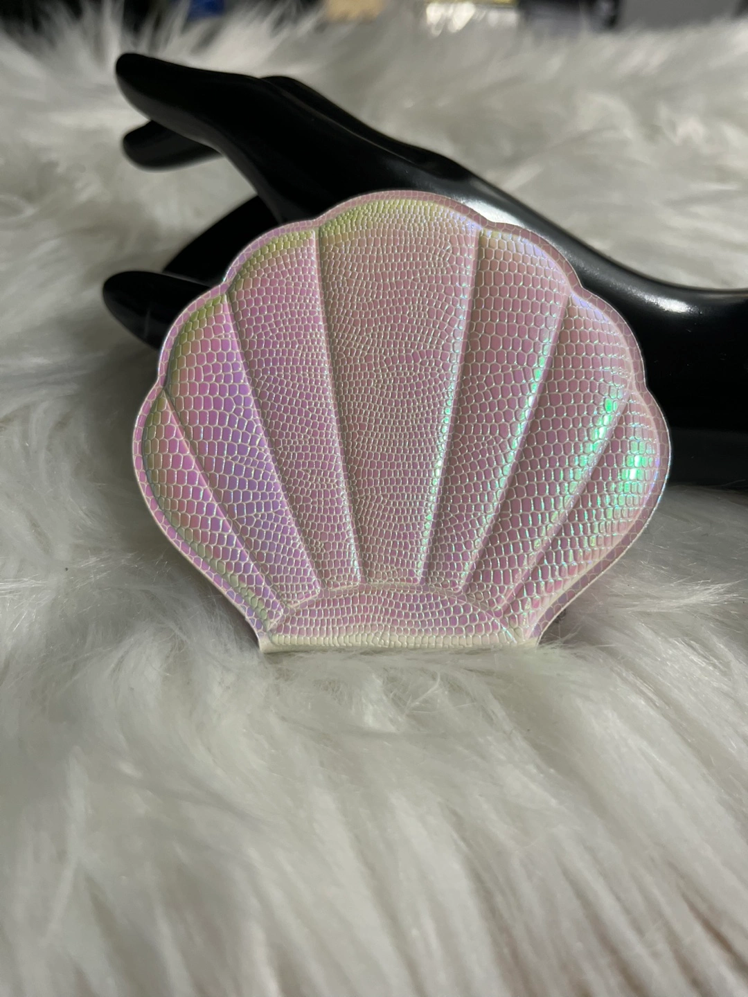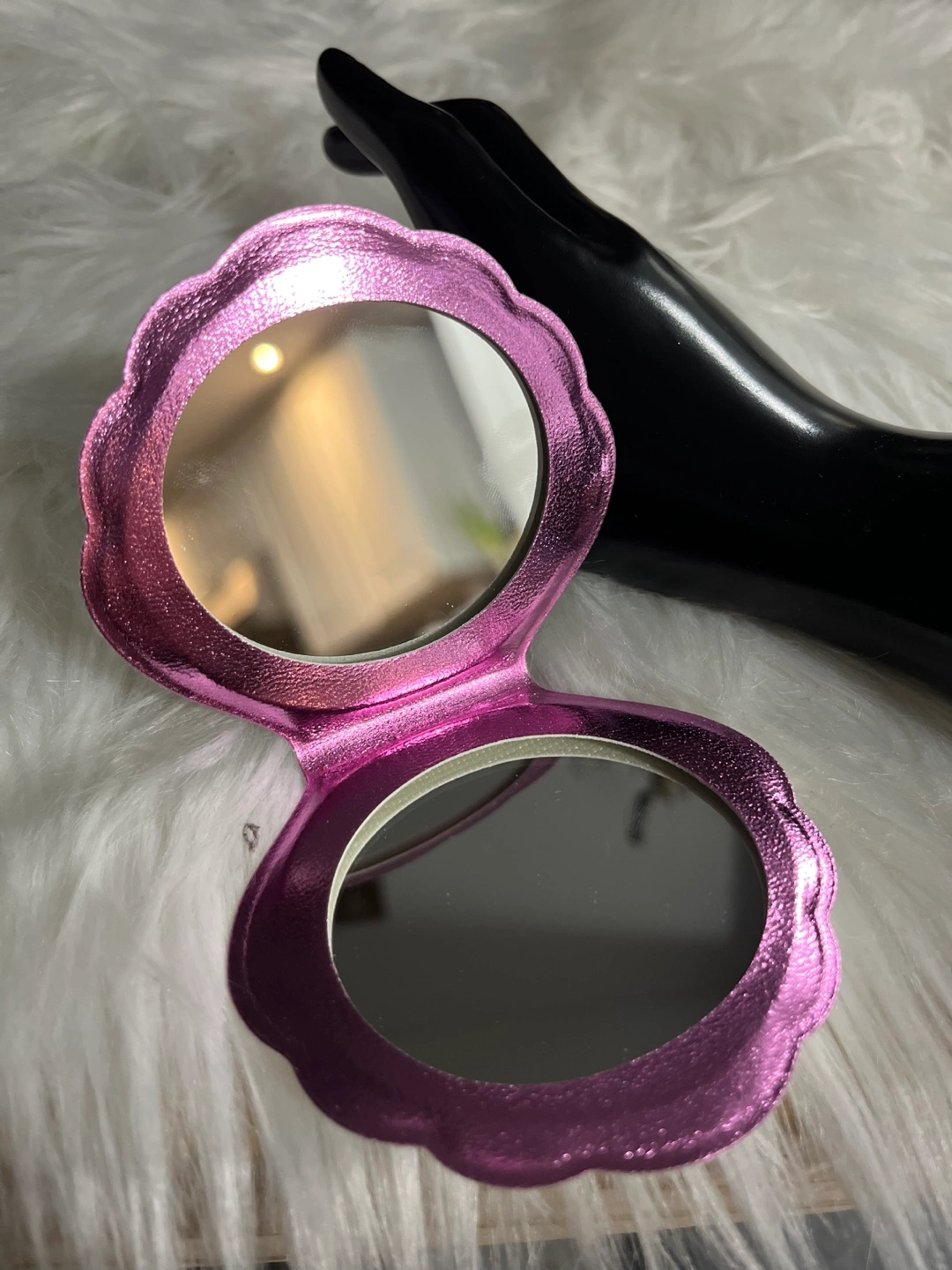 A cute pink compact mirror. Shell-shaped exterior. Two mirrors inside. A wonderful item to have in your purse for quick touch ups.