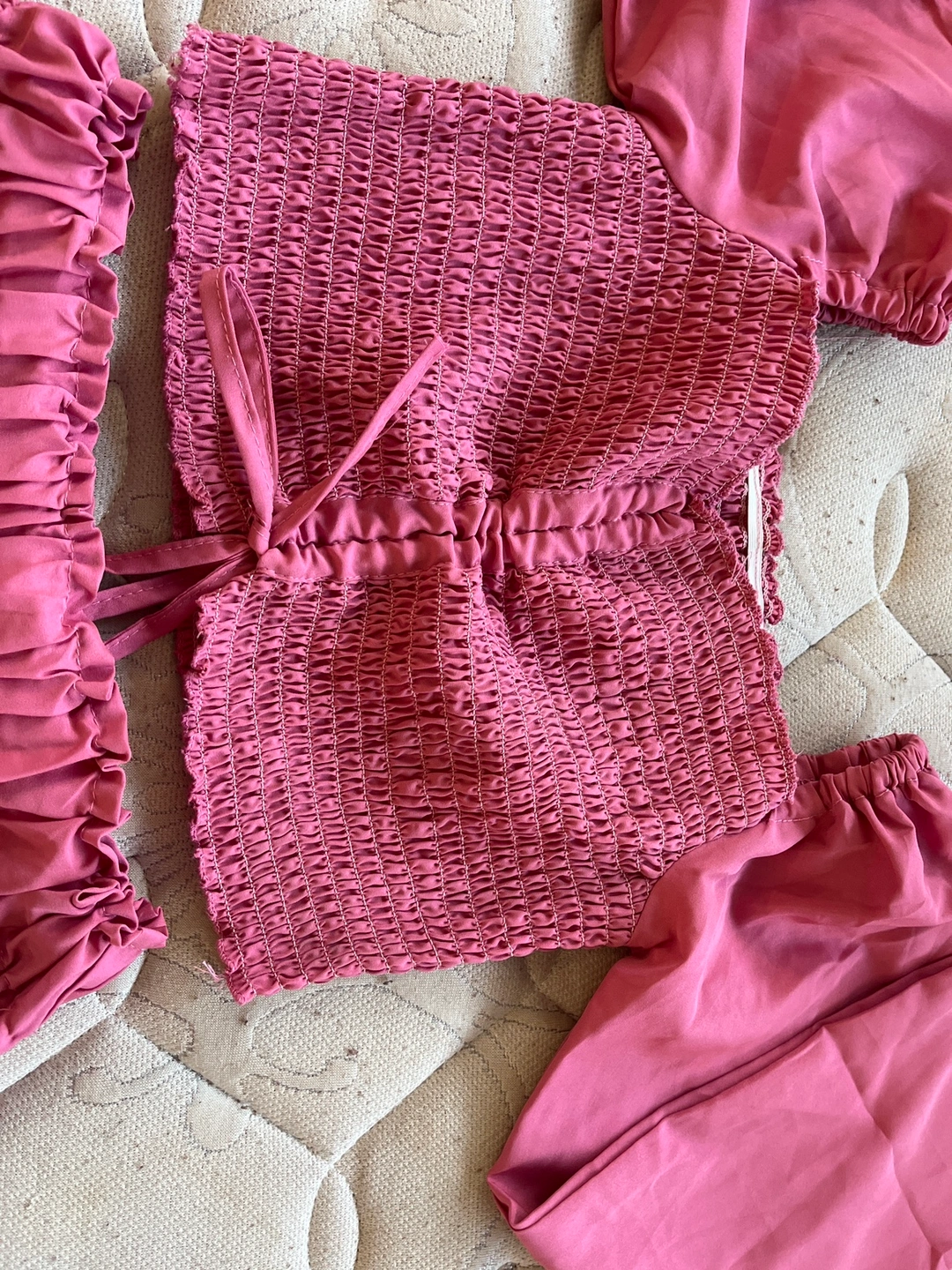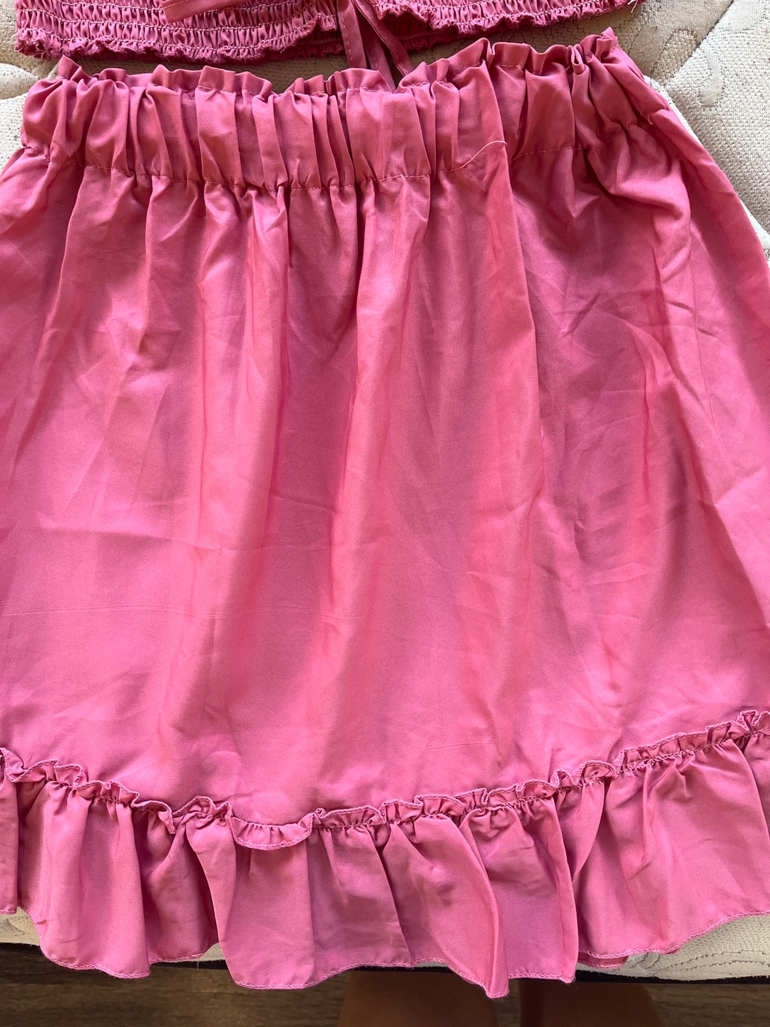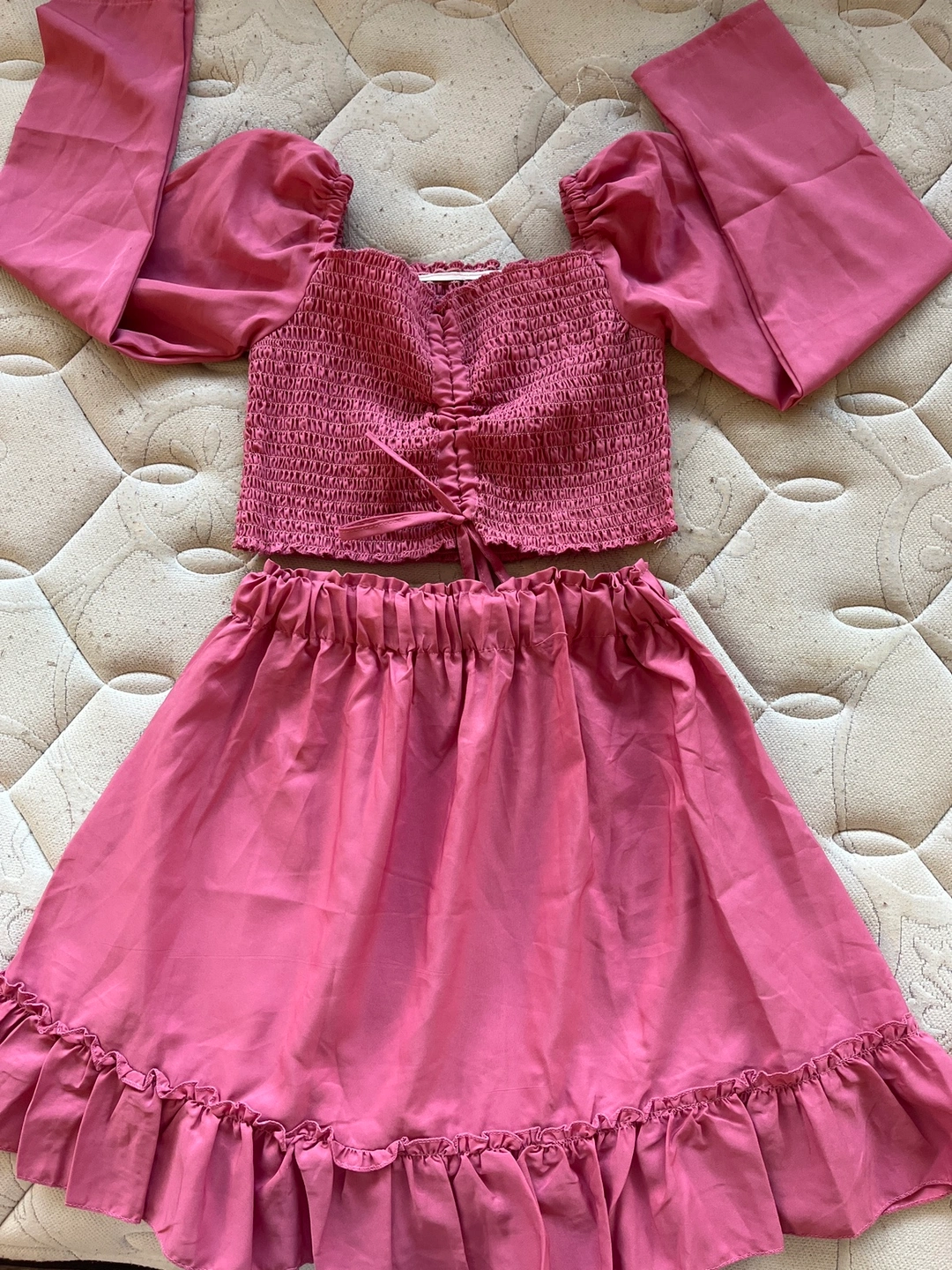 21Two piece set, crop top with long sleeves and a mini skirt. The top has a tie in the front. The skirt is a ruffle style. Both pieces are pink and made of a soft material.