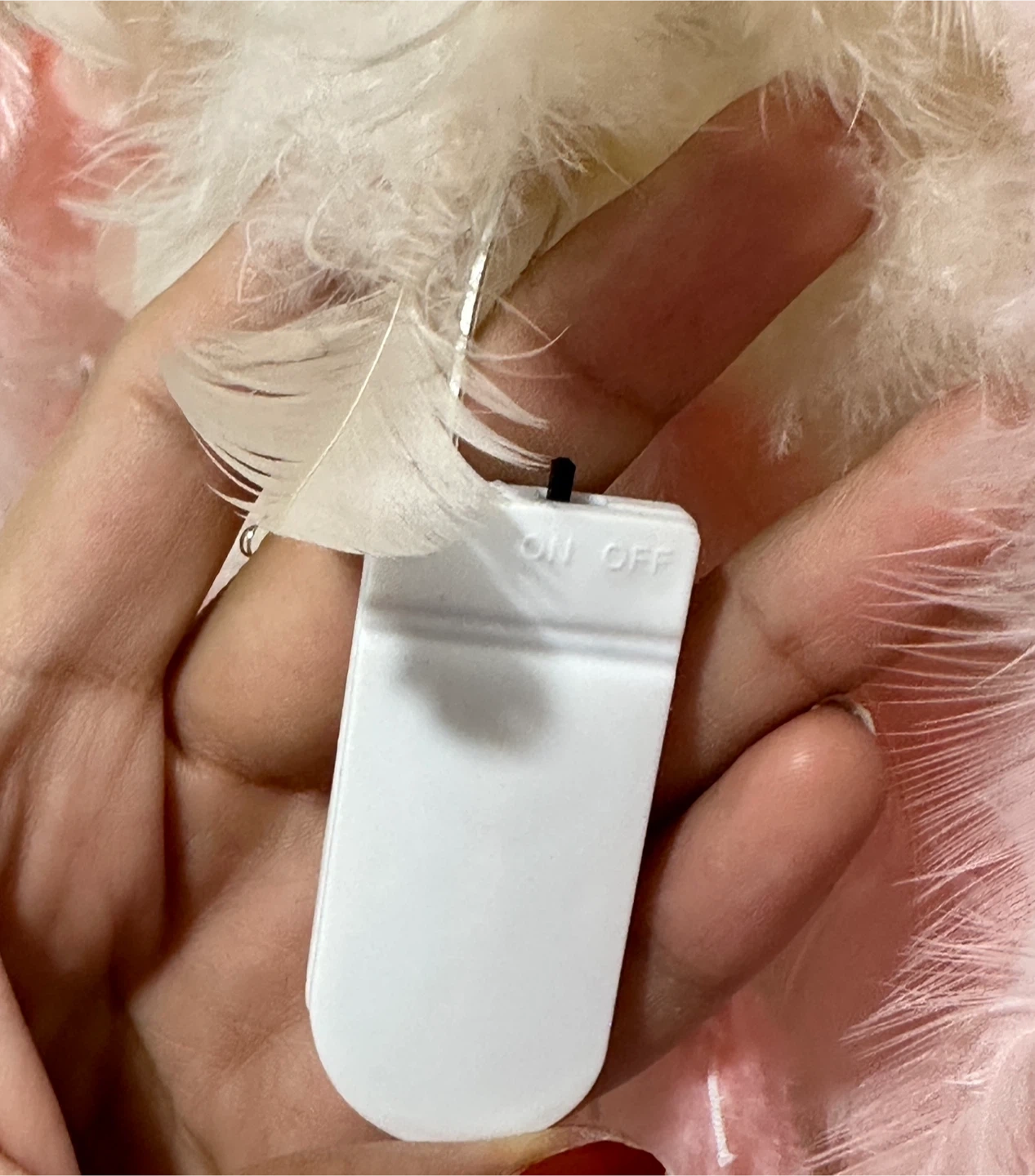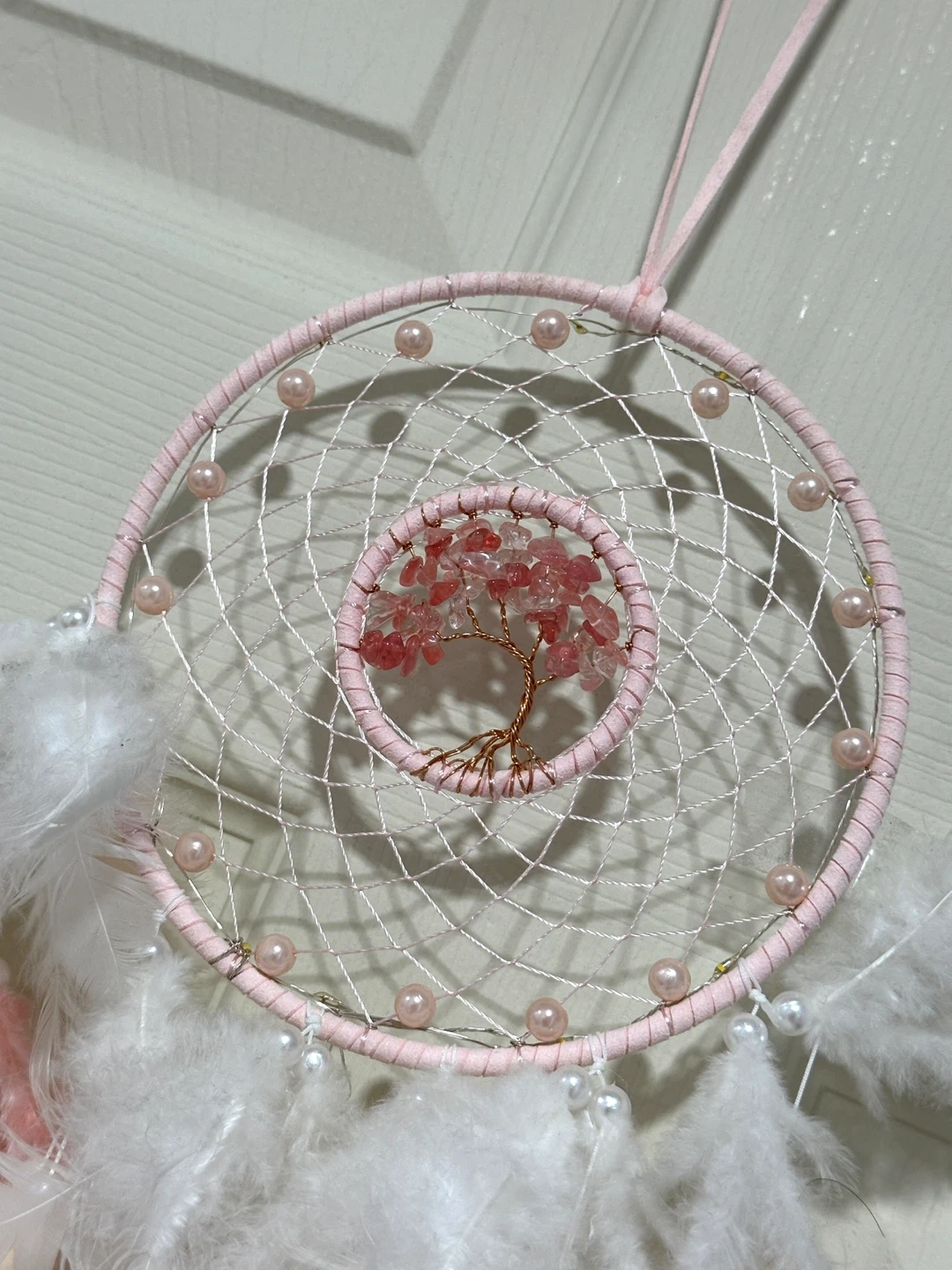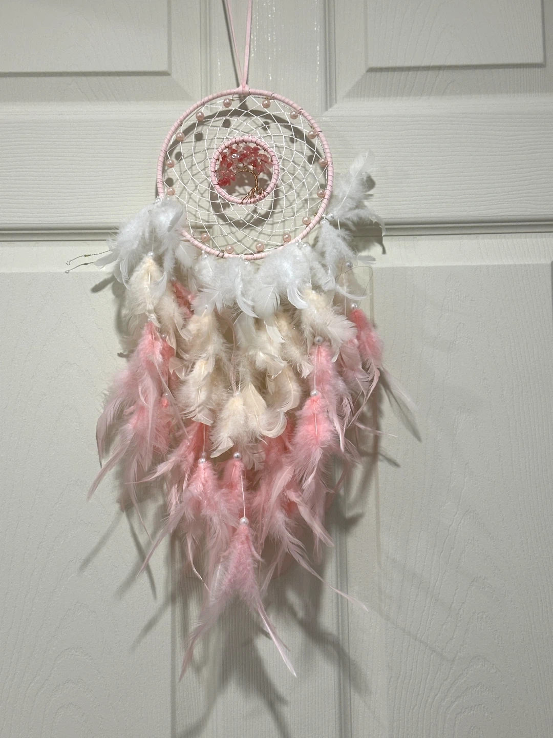 Selling a cute pink dream catcher! It has a lovely design with white and pink feathers and beads. It also has lights to add a cozy touch to any room.
