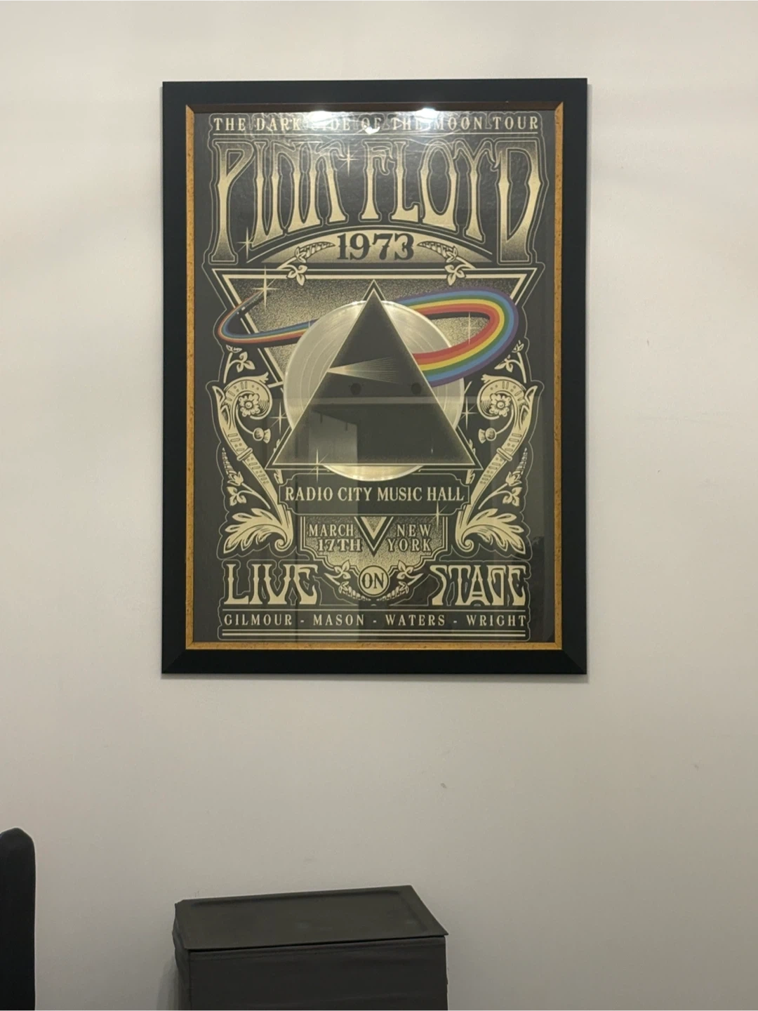 Selling a framed Pink Floyd poster from the 1973 Dark Side of the Moon tour. It features the iconic prism design and mentions Radio City Music Hall, March 17th, New York. Great for any Pink Floyd fan!