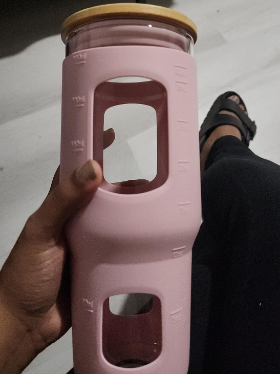 Selling a cute pink glass water bottle! It has a bamboo lid and a silicone sleeve with cutouts. Perfect for staying hydrated on the go it will come in packaging never used