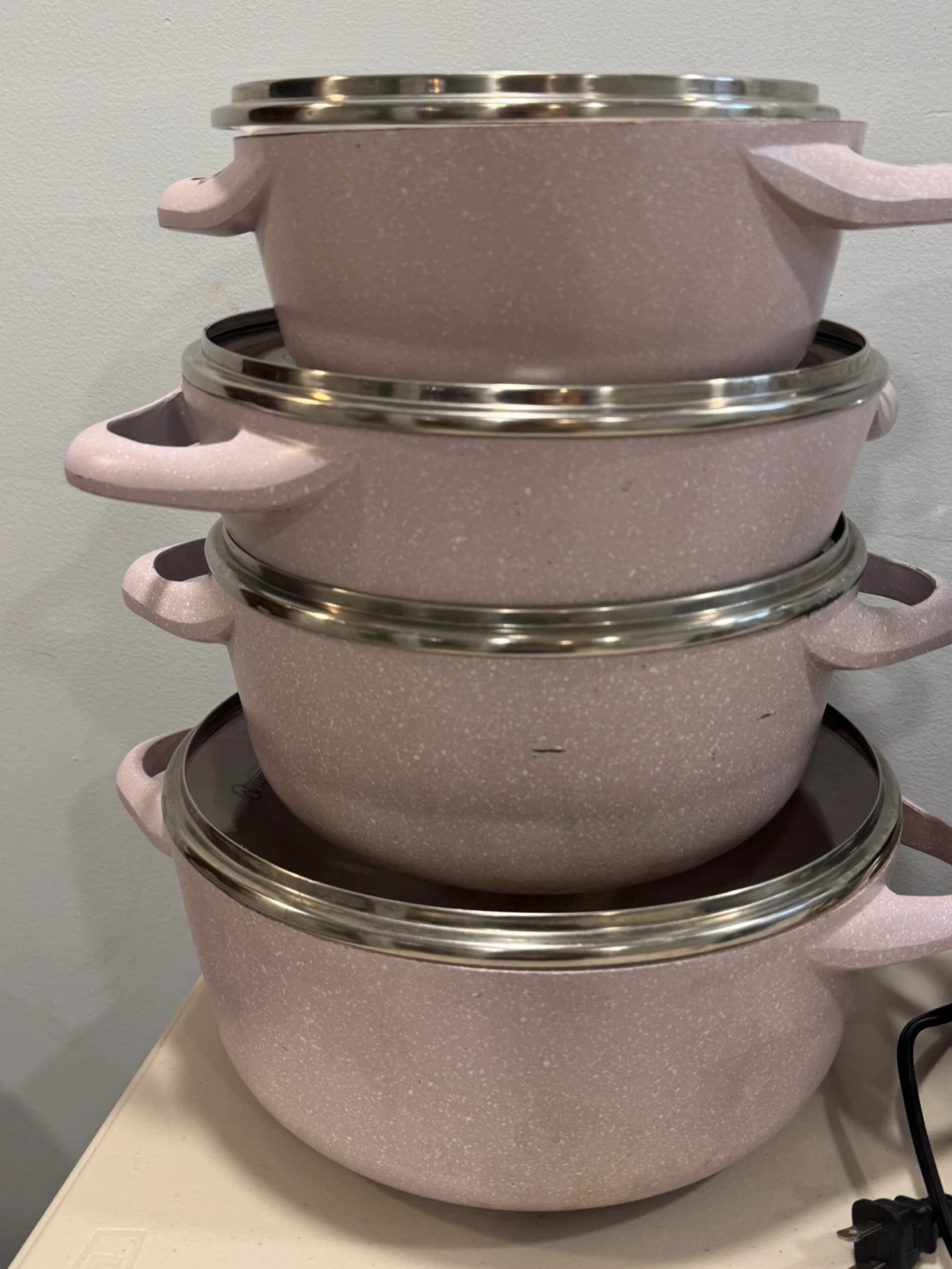10Selling a set of four lovely pink granite cookware pots! They've been gently used and are ready for a new home. Perfect for adding a touch of colour to your kitchen!