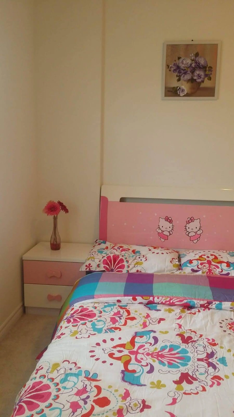 Pink Hello Kitty Bedroom Set. Includes bed, study stable, mattress, night table and a closet. It is in okay condition