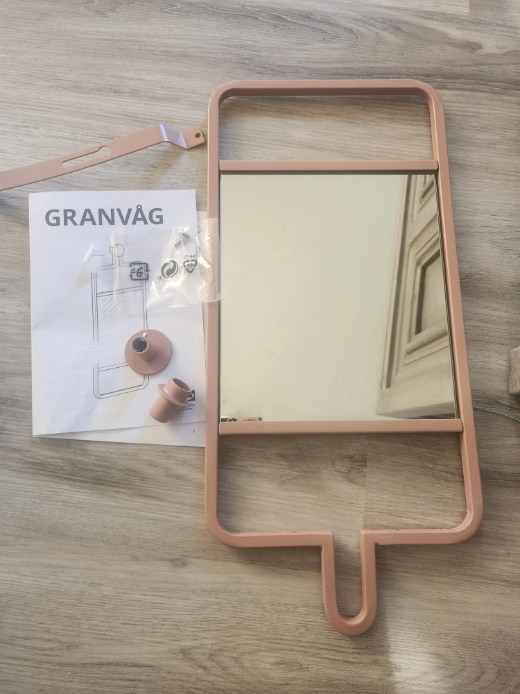 10Pink metal framed mirror with a shelf. Includes mounting hardware.