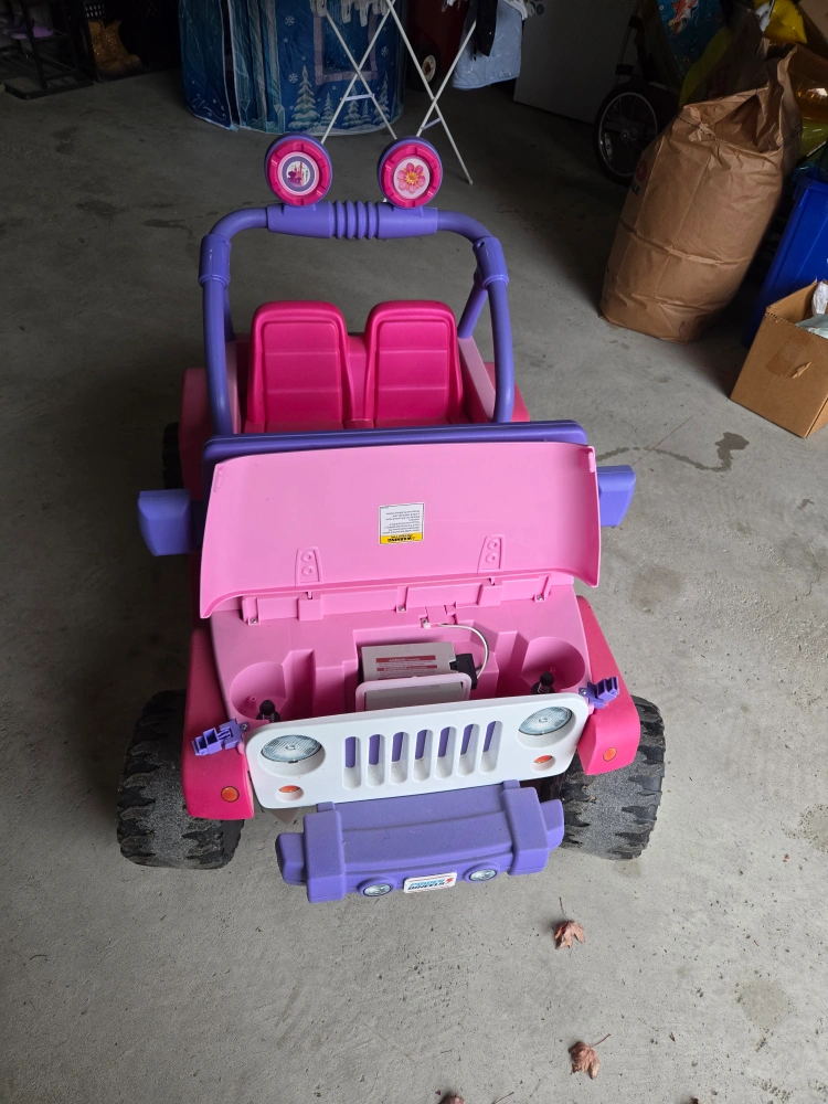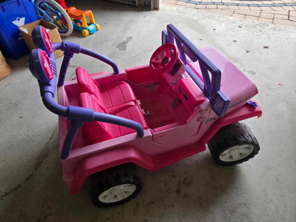 75Selling a pink Jeep Wrangler ride-on car! It's a fun little car for kids to ride around in. It has a pink and purple colour scheme. The car is in good condition and ready for a new owner