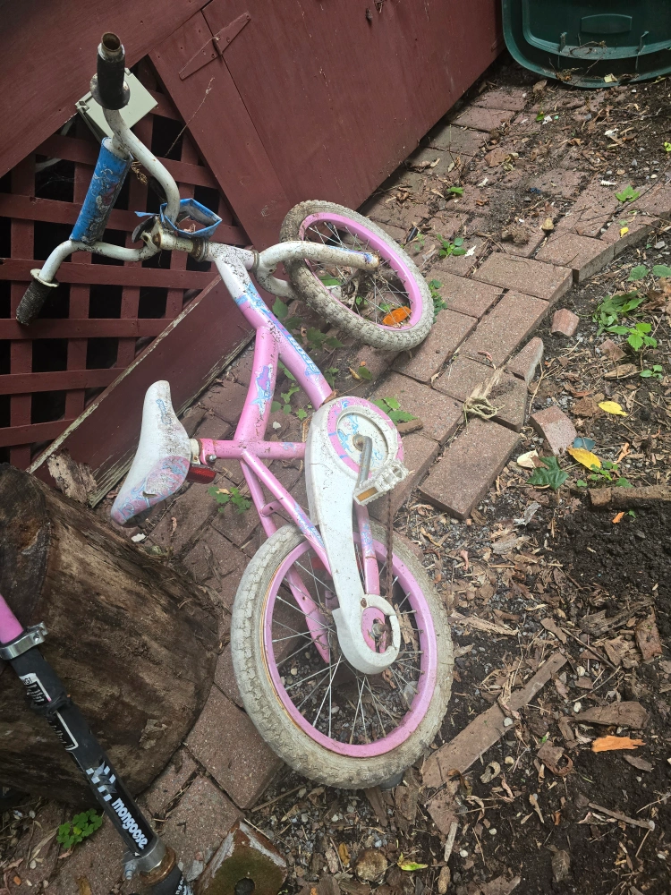 FREE a pink kids' bike. It has some signs of use, as you can see in the photos. Perfect for a child learning to ride!